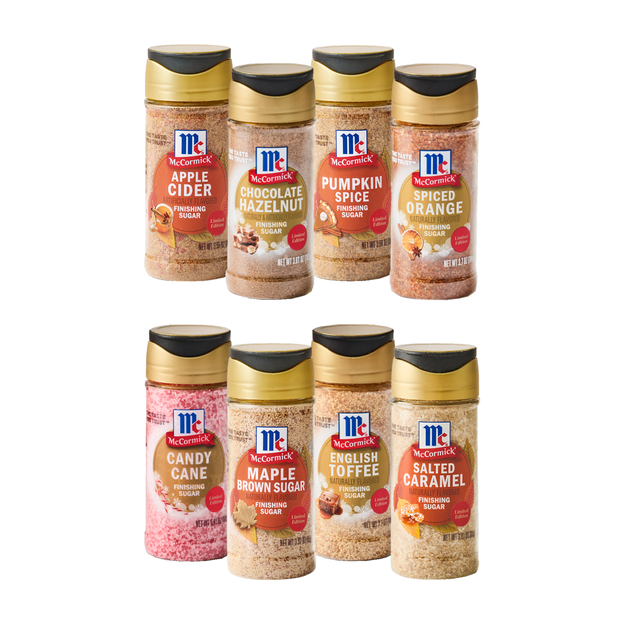 Shake on seasonal flavor with McCormick® Finishing Sugars Gift Pack. Includes eight festive flavors for sprinkling, baking, or mixing with your favorite recipes, and it makes the perfect gift! Includes one of each: Chocolate Hazelnut Naturally & Artificially Flavored: Rich chocolate & hazelnut. Spiced Orange Naturally Flavored: Twist of orange, a touch of warm spice. Candy Cane: Sweet peppermint, red & white sugar granules. English Toffee Naturally Flavored: Indulgent, buttery toffee flavor. Maple Brown Sugar Naturally Flavored: Sweet, fall-inspired taste. Apple Cider Artificially Flavored: Tart apple, warm spices, subtly sweet. Pumpkin Spice: Sweet with classic warm spices. Salted Caramel Naturally Flavored: Creamy caramel flavor, a hint of salt.