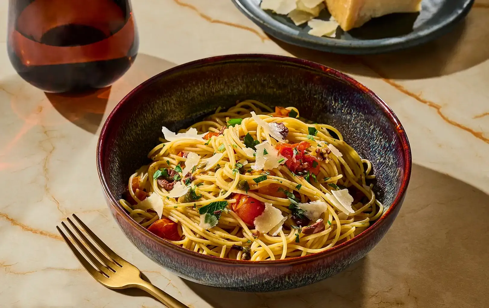 - Place hot cooked pasta in large serving bowl. Add tomato mixture, tossing gently to mix. Stir in additional reserved pasta water, if desired to loosen. Sprinkle with parsley and garnish with shaved parmesan cheese, to serve.