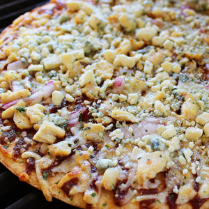 - Spread seasoned tomato sauce on crust. Layer with 1/2 of the mozzarella cheese, grilled chicken, onion, remaining mozzarella cheese and Cheddar cheese. Close lid. Grill 3 to 4 minutes longer or until cheese is melted and crust is browned. (Check pizza often to avoid burning. Rotate pizza, if necessary.) Sprinkle with blue cheese. Slide pizza onto baking sheet. Slice and serve immediately. Sprinkle with additional Spicy Montreal Steak Seasoning, if desired. Serve with celery or carrot sticks, if desired.