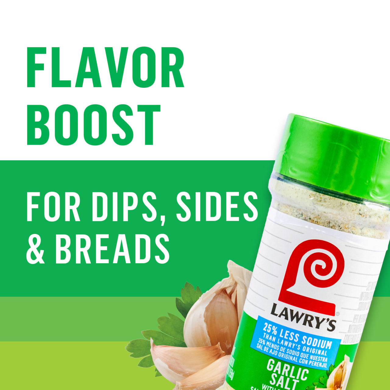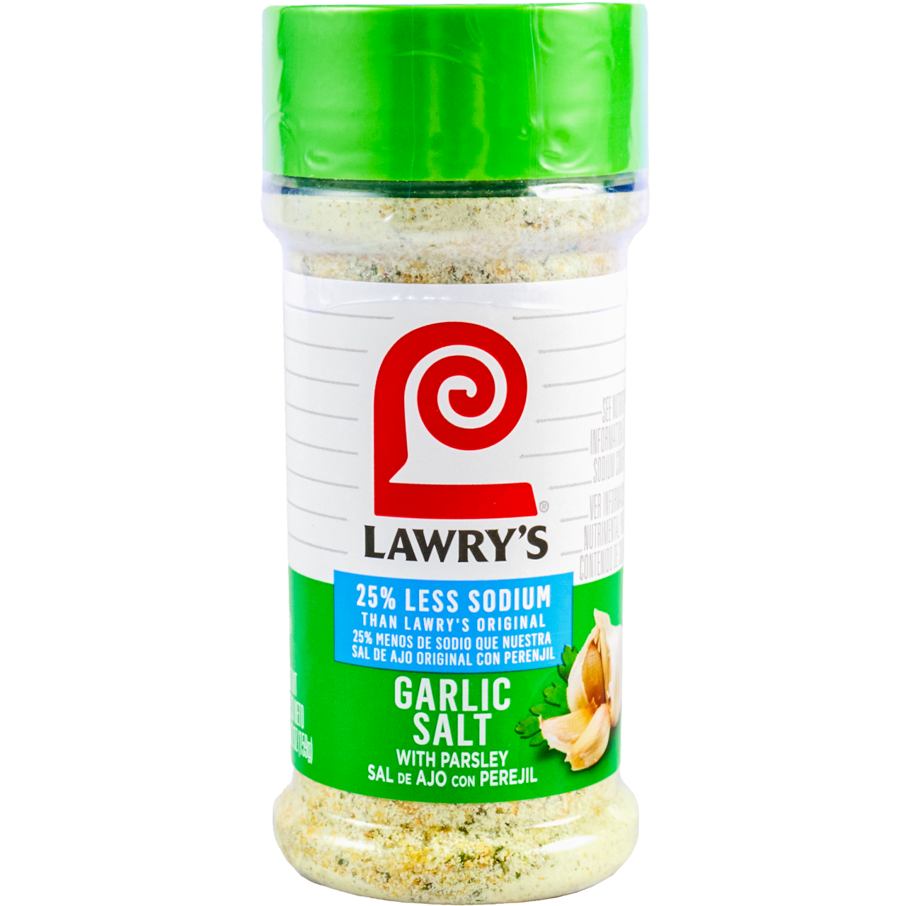 - LESS SODIUM: Lawry’s 25% Less Sodium Garlic Salt with Parsley is a mix of garlic, salt, and parsley flakes with 25% less sodium than our original garlic salt.