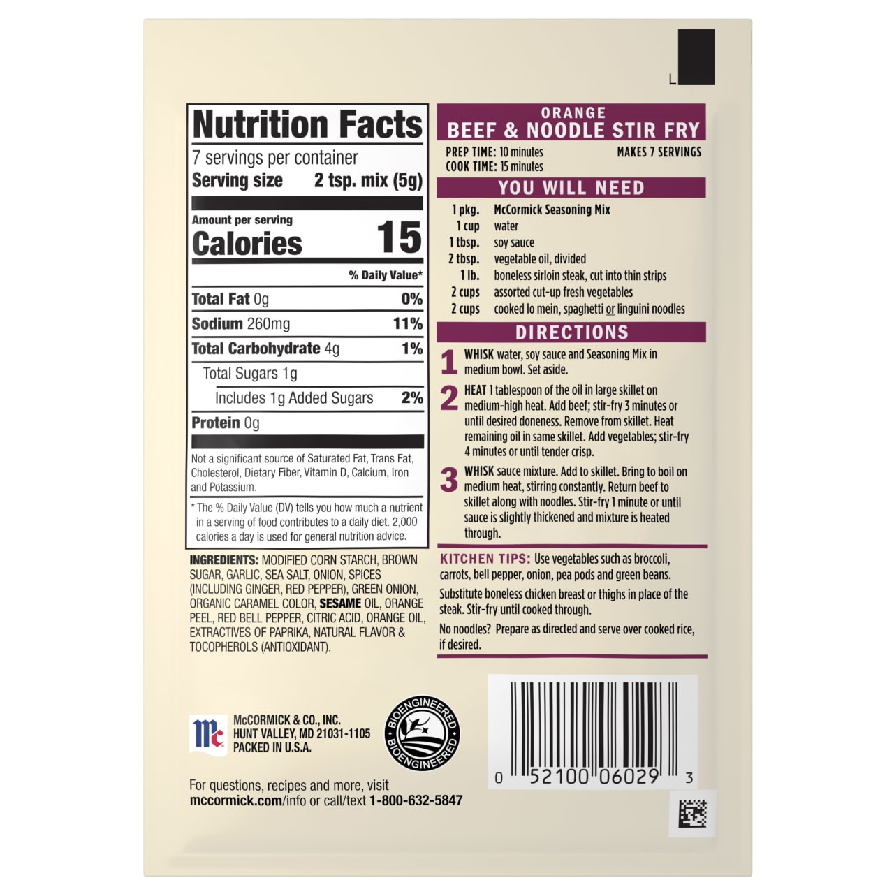 What's for dinner? McCormick® Orange Beef & Noodle Stir Fry Seasoning Mix helps you put together a complete meal that contains a protein, vegetable, and starch. In just 25 minutes, you can h....