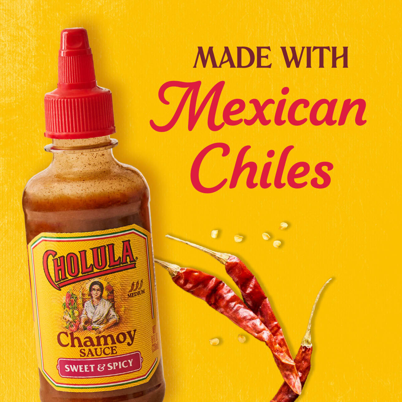 Cholula® Chamoy Sauce is a sweet, spicy, and tangy blend of vibrant flavors for all your favorite foods. Crafted with our signature Cholula Original Hot Sauce, arbol chiles, and sweet hibiscus, we ....