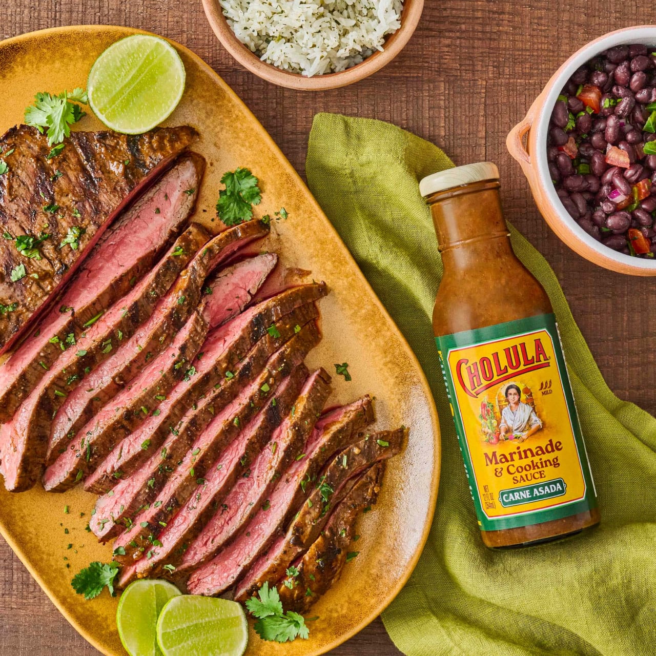 Get ready to ignite your tastebuds with Cholula® Carne Asada Marinade & Cooking Sauce. This bold, smoky blend of ancho, guajillo, and arbol chiles mixed with bright citrus juices transforms your favorite cut of meat into a tender, juicy masterpiece. A popular Tex-Mex dish, fajitas are loved for their versatility and delicious flavor. You can recreate a similar style of meal at home by preparing carne asada-style skirt steak, flank steak or flap steak, and sliced onions and bell peppers with marinade and cooking sauce. Once meat is cooked through, spoon into in warm four tortillas and garnish with favorite toppings – and a generous shake of Cholula Hot Sauce.