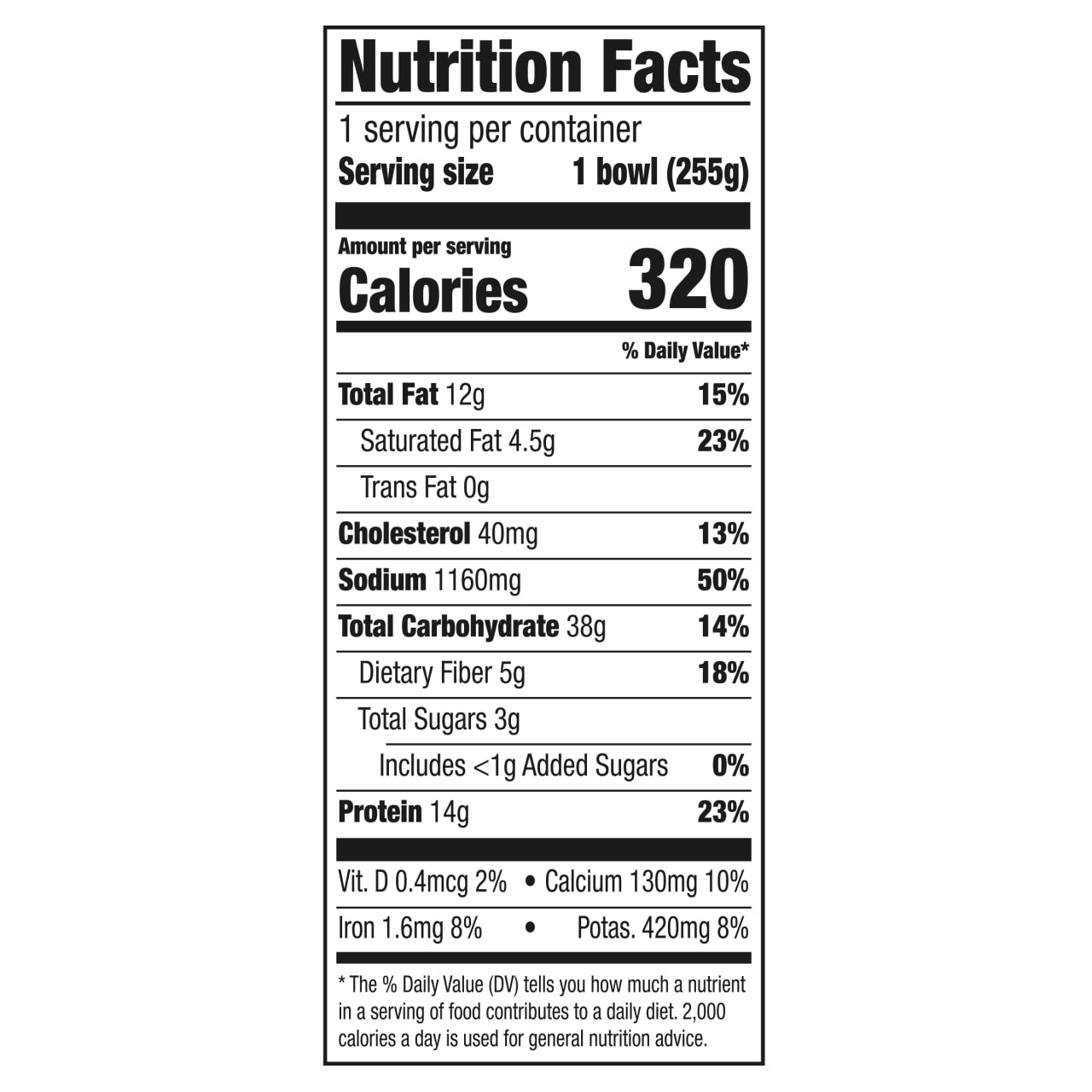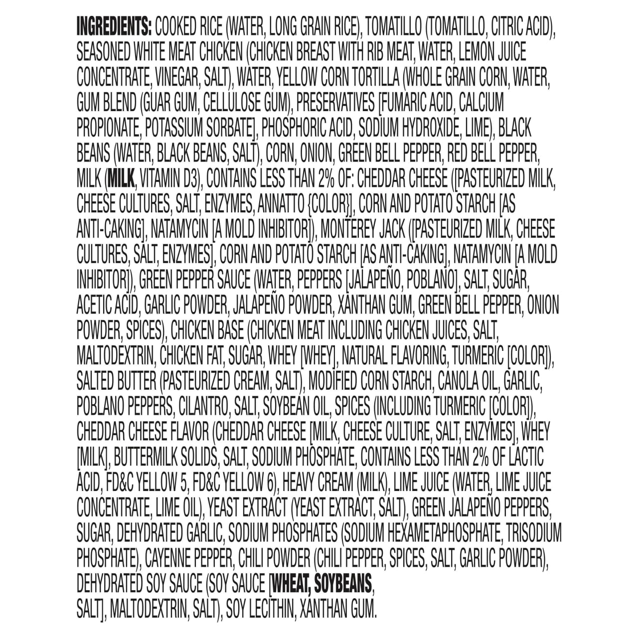 INGREDIENTS: COOKED RICE (WATER, LONG GRAIN RICE), TOMATILLO (TOMATILLO, CITRIC ACID), SEASONED WHITE MEAT CHICKEN (CHICKEN BREAST WITH RIB MEAT, WATER, LEMON JUICE CONCENTRATE, VINEGAR, SALT), WATER, YELLOW CORN TORTILLA (WHOLE GRAIN CORN, WATER, GUM BLEND [GUAR GUM, CELLULOSE GUM], PRESERVATIVES [FUMARIC ACID, CALCIUM PROPIONATE, POTASSIUM SORBATE], PHOSPHORIC ACID, SODIUM HYDROXIDE, LIME), BLACK BEANS (WATER, BLACK BEANS, SALT), CORN, ONION, GREEN BELL PEPPER, RED BELL PEPPER, MILK (MILK, VITAMIN D3), CONTAINS LESS THAN 2% OF: CHEDDAR CHEESE (PASTEURIZED MILK, CHEESE CULTURES, SALT, ENZYMES, ANNATTO COLOR), CORN AND POTATO STARCH (AS ANTI-CAKING), NATAMYCIN (A MOLD INHIBITOR), MONTEREY JACK (PASTEURIZED MILK, CHEESE CULTURES, SALT, ENZYMES), GREEN PEPPER SAUCE (WATER, PEPPERS [JALAPEÑO, POBLANO], SALT, SUGAR, ACETIC ACID, GARLIC POWDER, JALAPEÑO POWDER, XANTHAN GUM, GREEN BELL PEPPER, ONION POWDER, SPICES), CHICKEN BASE (CHICKEN MEAT INCLUDING CHICKEN JUICES, SALT, MALTODEXTRIN, CHICKEN FAT, SUGAR, WHEY, NATURAL FLAVORING, TURMERIC [COLOR]), SALTED BUTTER (PASTEURIZED CREAM, SALT), MODIFIED CORN STARCH, CANOLA OIL, GARLIC, POBLANO PEPPERS, CILANTRO, SALT, SOYBEAN OIL, SPICES (INCLUDING TURMERIC [COLOR]), CHEDDAR CHEESE FLAVOR (CHEDDAR CHEESE [MILK, CHEESE CULTURE, SALT, ENZYMES]), WHEY (MILK), BUTTERMILK SOLIDS, SALT, SODIUM PHOSPHATE, CONTAINS LESS THAN 2% OF: LACTIC ACID, FD&C YELLOW 5, FD&C YELLOW 6, HEAVY CREAM (MILK), LIME JUICE (WATER, LIME JUICE CONCENTRATE, LIME OIL), YEAST EXTRACT (YEAST EXTRACT, SALT), GREEN JALAPEÑO PEPPERS, SUGAR, DEHYDRATED GARLIC, SODIUM PHOSPHATES (SODIUM HEXAMETAPHOSPHATE, TRISODIUM PHOSPHATE), CAYENNE PEPPER, CHILI POWDER (CHILI PEPPER, SPICES, SALT, GARLIC POWDER), DEHYDRATED SOY SAUCE (SOY SAUCE [WHEAT, SOYBEANS, SALT], MALTODEXTRIN, SALT), SOY LECITHIN, XANTHAN GUM. Contains: Wheat, Soy, Milk.