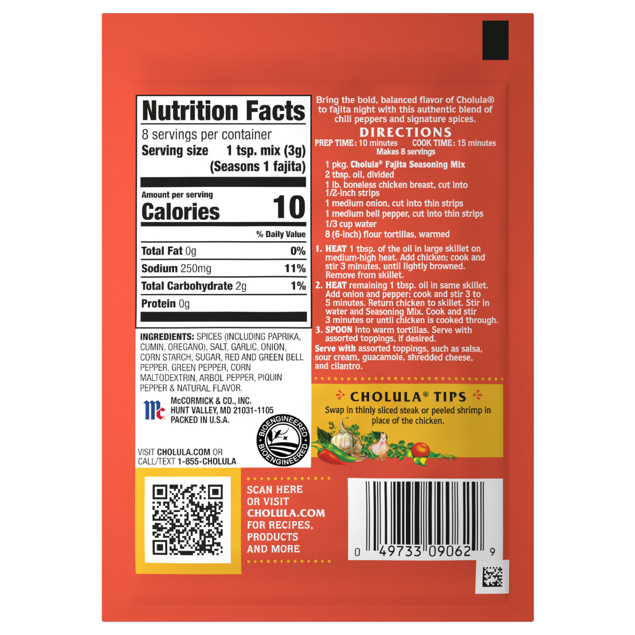 Invite flavor to your table with Cholula Original Fajita Medium Seasoning Mix. This bold, balanced blend of chili peppers and signature spices makes it easy to serve up a craveable fajitas any night of the week. A popular Tex-Mex dish, fajitas are loved for their versatility and delicious flavor. You can recreate a similar style of meal at home by preparing seasoning mix with chicken, steak, or pork, and sliced onions and peppers. Serve in warm four tortillas and garnish with favorite toppings – and a generous shake of Cholula Hot Sauce.