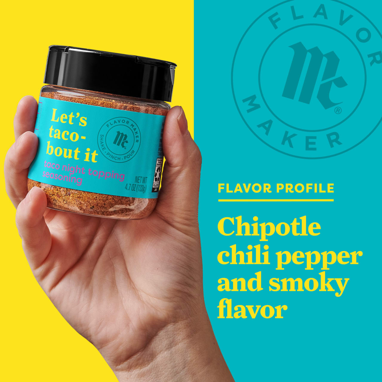 Let's taco ‘bout how good McCormick® Flavor Maker Taco Night Topping Seasoning really is. Made with minimal ingredients, it delivers a boost of chipotle chili pepper and smoky flavor to tacos, n....