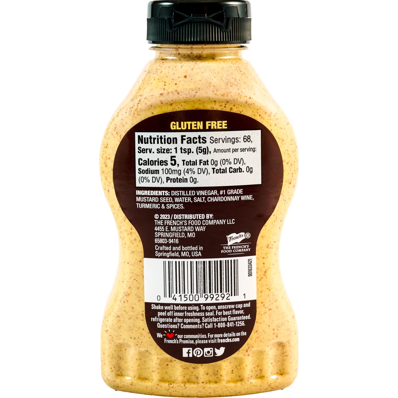 Our boldest Dijon yet. This classy — yet sassy — mustard is one powerful condiment. Squeeze French's® Stone Ground Dijon Mustard onto deli sandwiches and burger buns or mix it into deviled eggs to add a spicy, mustardy kick. Made with #1 grade mustard seeds and real Chardonnay, French's Stone Ground Dijon Mustard brings delicious flavor to roasted salmon, vinaigrettes and even glazed ham. Crafted with quality ingredients, you won't find any artificial flavors, colors, gluten or high-fructose corn syrup here.