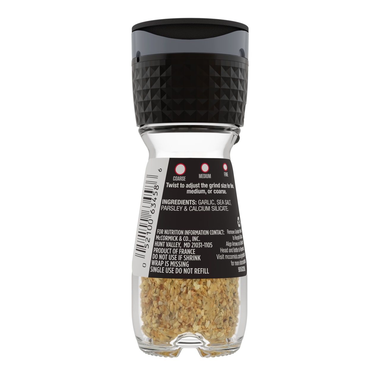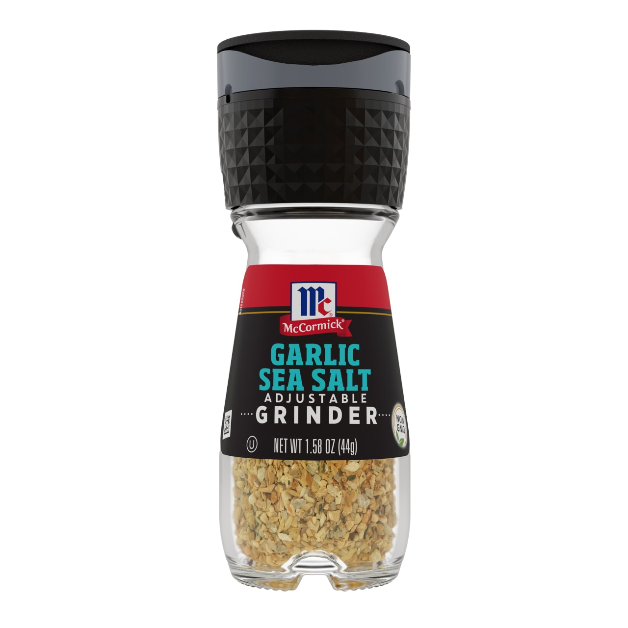 McCormick® Garlic Sea Salt Grinder is a savory blend of garlic and sea salt flecked with parsley. With a built-in adjustable grinder, you can twist it on most anything, including pizza, chicken, be....