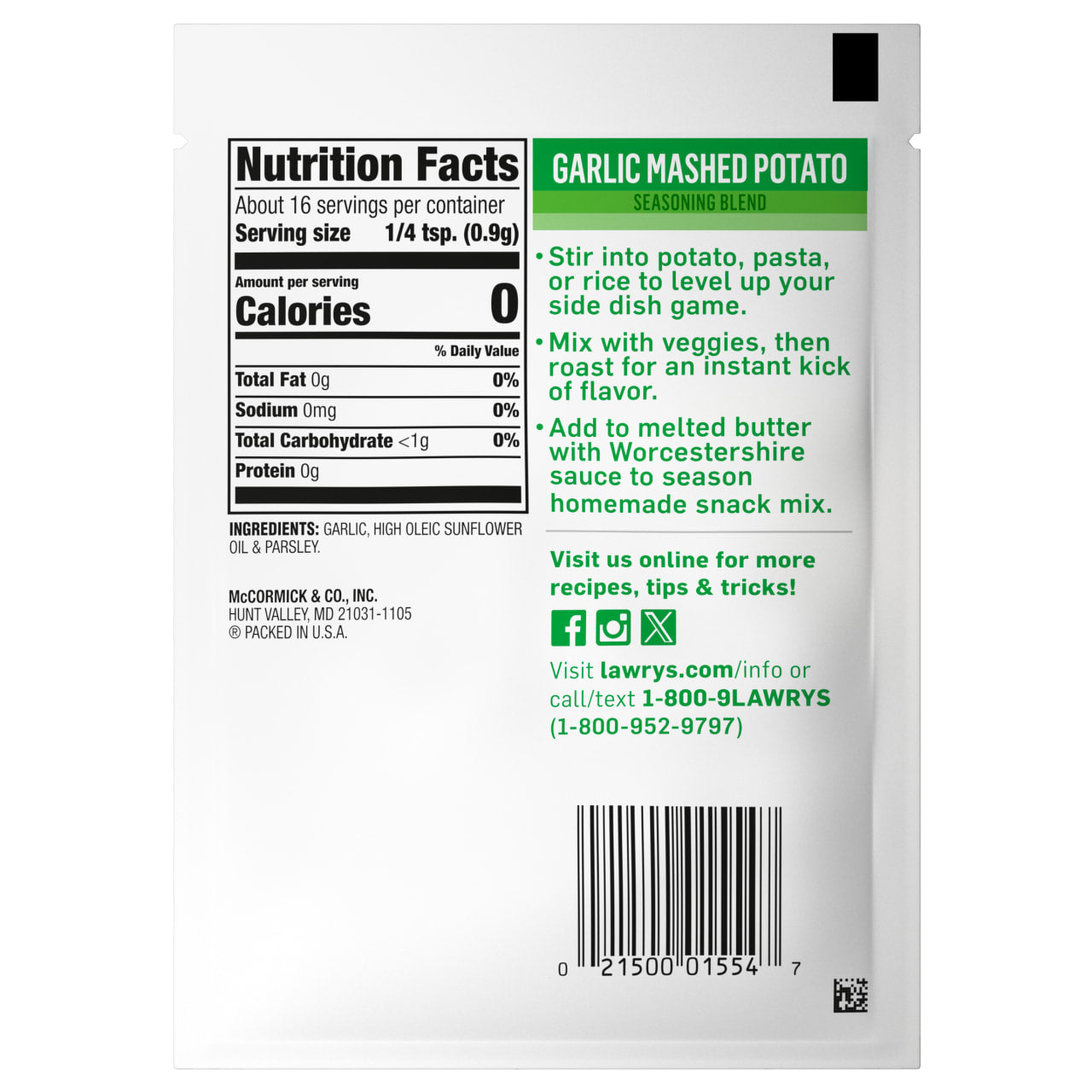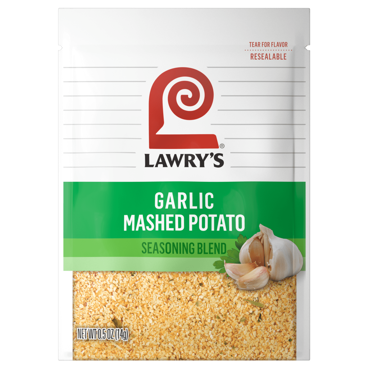Bring the zing to the holidays and beyond with Lawry's Garlic Mashed Potato Seasoning Blend. This versatile seasoning is full of robust, garlicky flavor that adds a mouthwatering savoriness to everything it touches. Each convenient, re-sealable bag of seasoning is here to make your holidays and everydays full of craveable flavor – with less effort. Just tear open the package to pour into or over your favorite foods for garlic flavor that can't be beat.