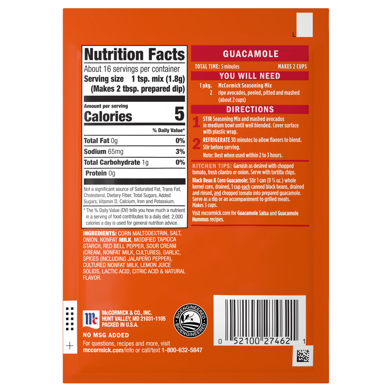 Add south-of-the-border flavor to your next party or taco night with McCormick Guacamole Seasoning Mix. Our signature blend of McCormick spices puts flavors of garlic, red bell peppers and jalapeños at your fingertips to deliver the perfect guacamole every time. Our guacamole mix contains no artificial flavors or added MSG- because your family and friends deserve the very best. For restaurant-quality guacamole in minutes, simply mix with 2 mashed ripe avocados. Serve this classic dip with tortilla chips or use to top Mexican favorites like tacos or nachos. Add black beans, corn and chopped tomato to the guacamole for a southwestern twist. Visit mccormick.com more variations, like Guacamole Salsa or Guacamole Hummus.