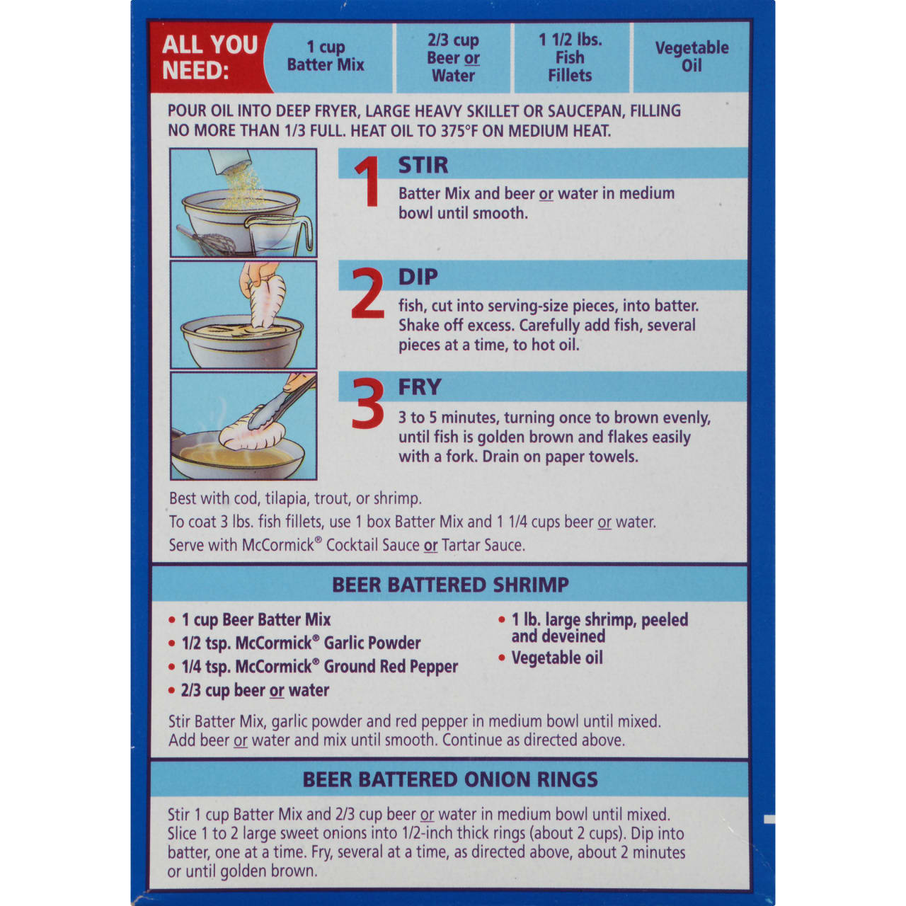 McCormick Golden Dipt Beer Seafood Batter Mix, Corn flour, pepper and other ingredients are specially blended to give a beer taste without hiding the flavor of seafood.