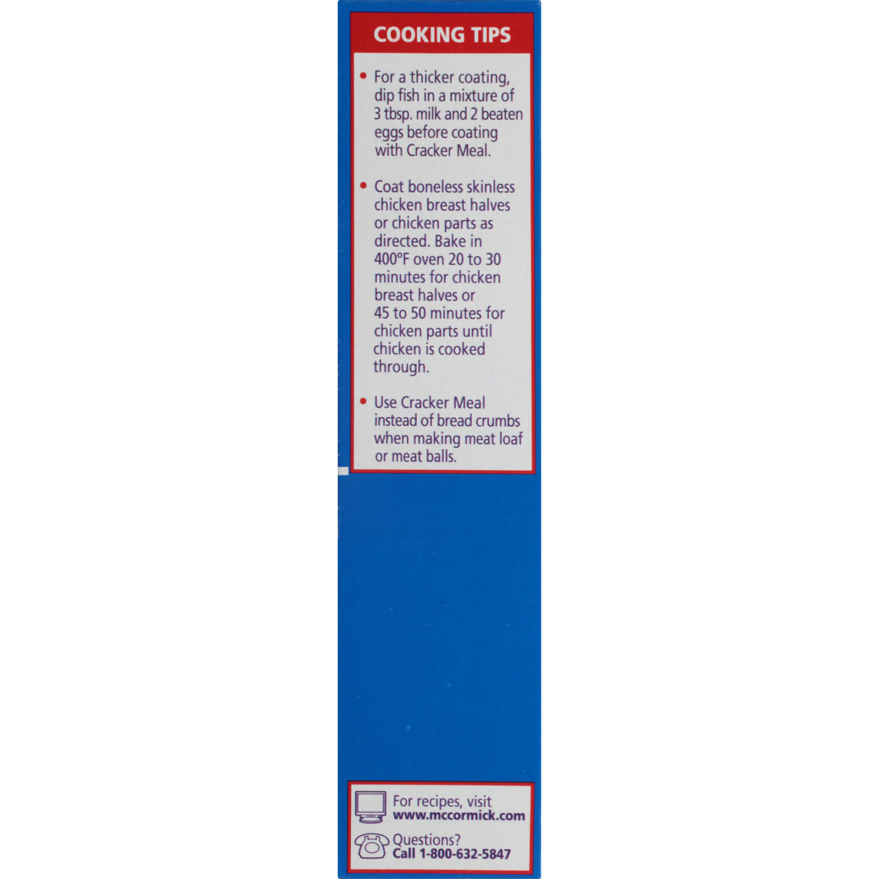 Oven-Fry: Cover bottom of shallow baking pan with melted butter. Arrange fish or seafood in a single layer in pan. Turn to coat with butter. Bake in preheated 425degF oven 10 to 20 minutes or until fish is golden brown around edges and fish flakes easily with a fork.Best with tilapia, trout, catfish, shrimp, or scallops. Also try with shucked oysters and clams, or soft-shell crabs (piece several times before coating)Entire package coats 4 lbs. fish or seafood.Serve with McCormick® Cocktail sauce or tartar sauce. All You Need:1/2 cup Cracker Meal1 lb. Fish or SeafoodWater or MilkVegetable Oil1. Pour: Cracker Meal into shallow dish or large plastic bag. Moisten fish, cut into serving-size pieces, or seafood with water or milk. Shake off excess.2. Coat: Fish, several pieces at a time, evenly with Cracker Meal. Let stand 5 minutes. Discard any remaining Cracker Meal.Fry as directed below.Pan-Fry: Pour oil into large skillet, filling to a depth of 1/4 inch. Heat to 350degF on medium heat. Fry fish, several pieces at a time, 2 to 4 minutes on each side or until fish flakes easily with a fork. Drain on paper towels.