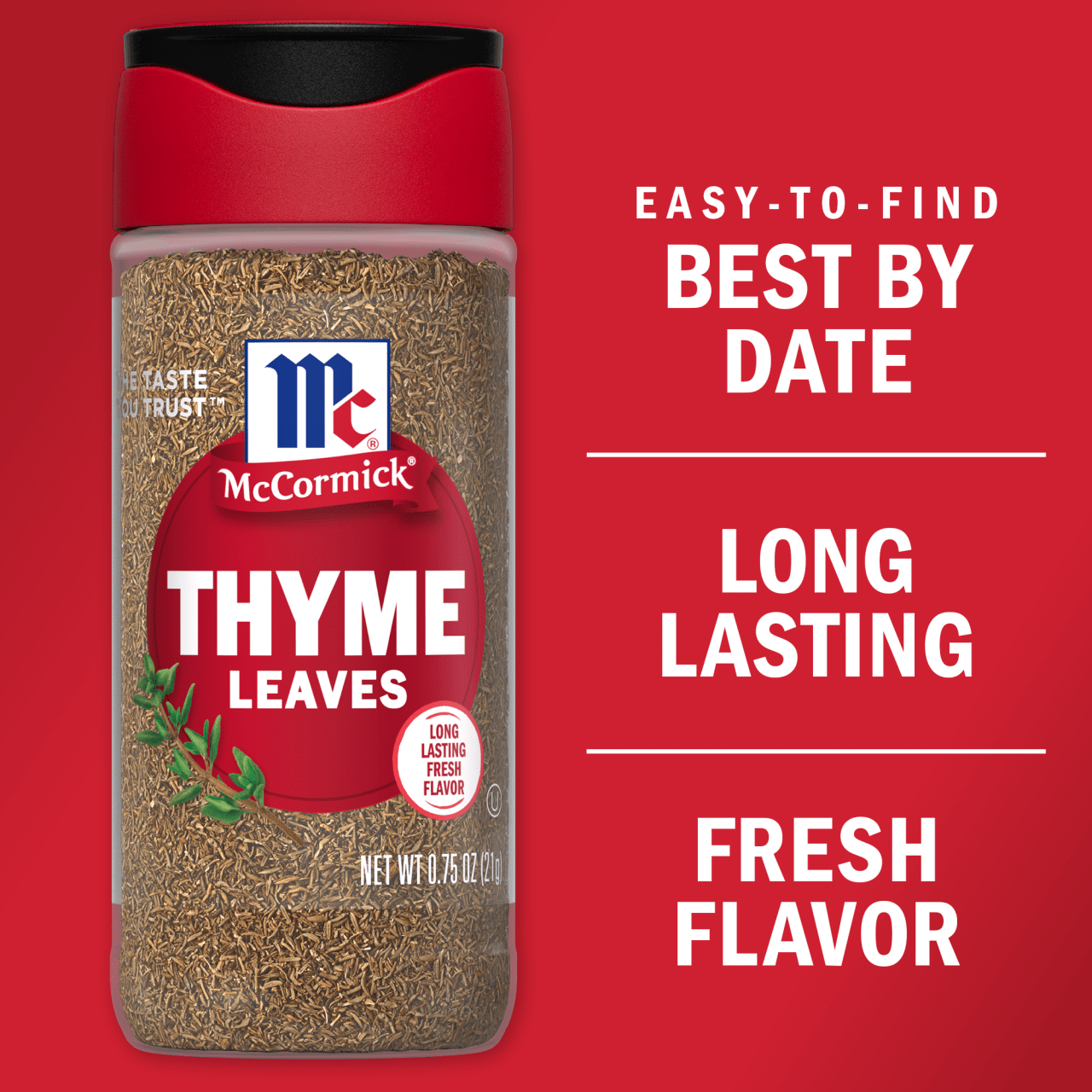 One of our more popular herbs, McCormick® Thyme Leaves bring mellow herb flavor and sweet aroma. It elevates beef stew, chicken pot pie, casseroles, roasted potatoes and meatless dishes with a warm....