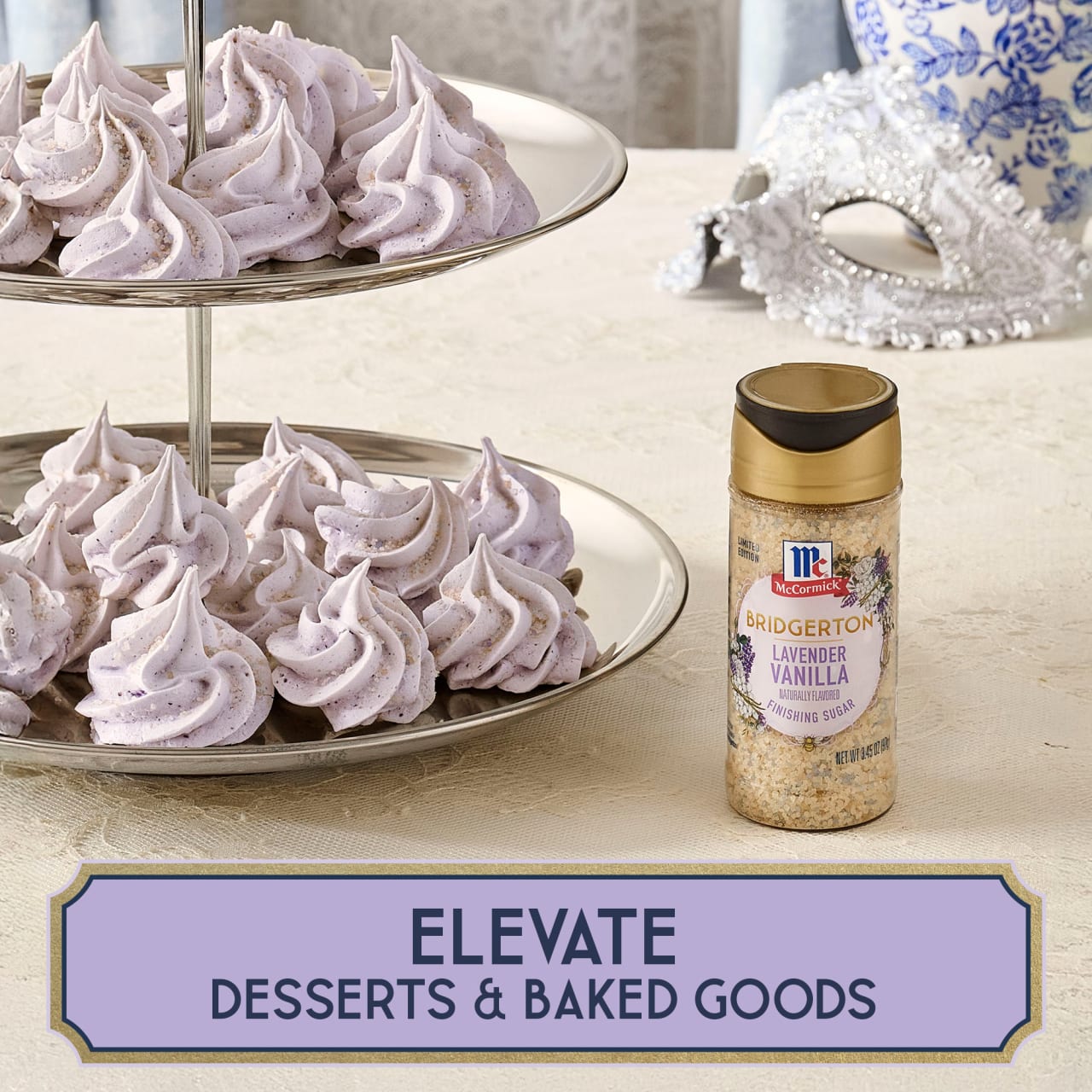 Shake on the floral notes of lavender and smooth vanilla with McCormick® Bridgerton™ Lavender Vanilla Naturally Flavored Finishing Sugar, Limited Edition. A timeless duo, lavender and vanilla bring inspired flavor to desserts, beverages, cocktail garnishes, and more. For a sensory experience that is sure to be this social season's culinary muse, this finishing sugar gracefully melts at the touch of warmth, making it the perfect infusion of flavor for teas, mocktails, and lavender matcha lattes. For elevated baked goods, sprinkle as a finishing touch onto frosted cupcakes, cakes, or cookies.