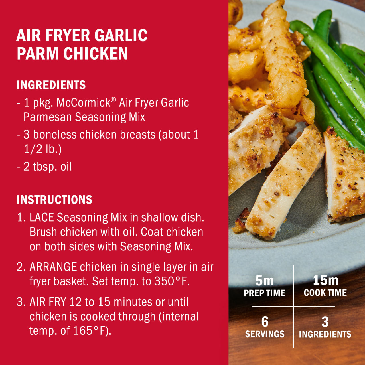 Take the guesswork out of dinner with McCormick® Air Fryer Garlic Parmesan Seasoning Mix. Combine it with chicken or frozen fries for an easy, crispy meal packed with cheesy, garlicky flavor — i....