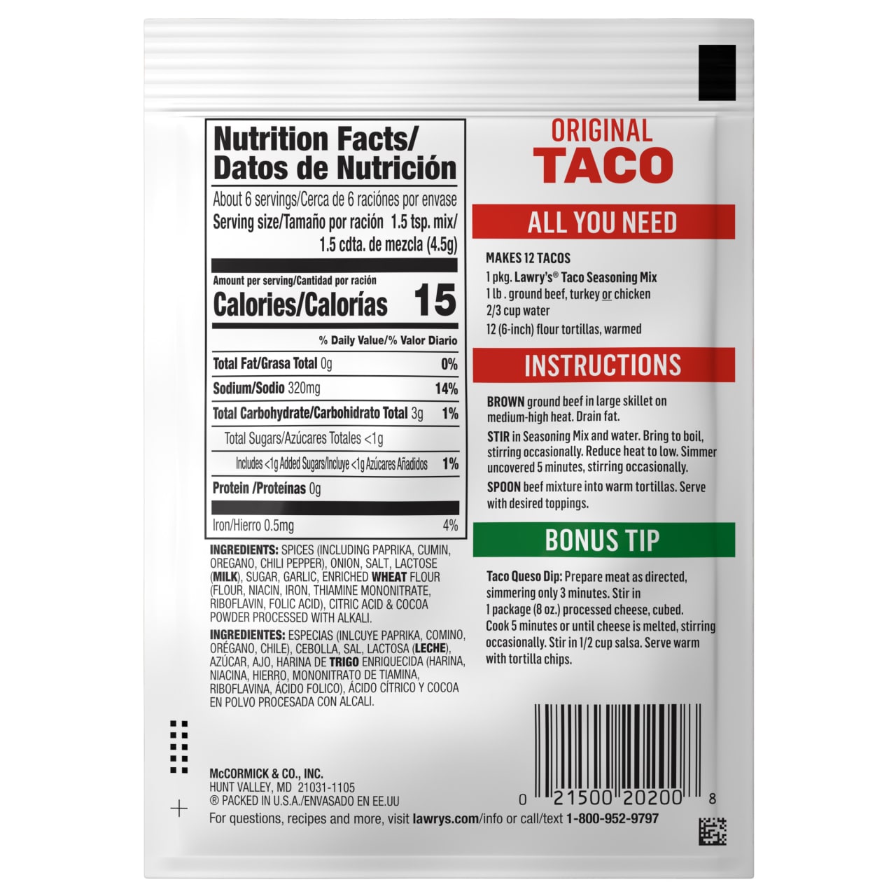 Lawry's Taco Spices & Seasonings Mix features a blend of onion, garlic, and spices such as paprika, cumin, oregano, and chili pepper to transform weeknight dinners or weekend get-togethers i....