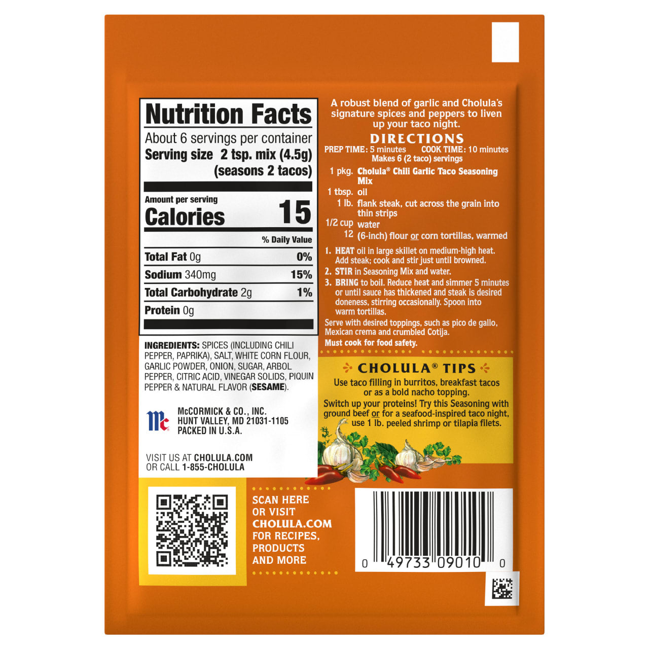 A robust blend of garlic, arbol and piquin peppers, and the signature spices of Cholula® Hot Sauce to liven up taco night. Our Chili Garlic Taco Seasoning Mix makes authentic Mexican steak tacos....