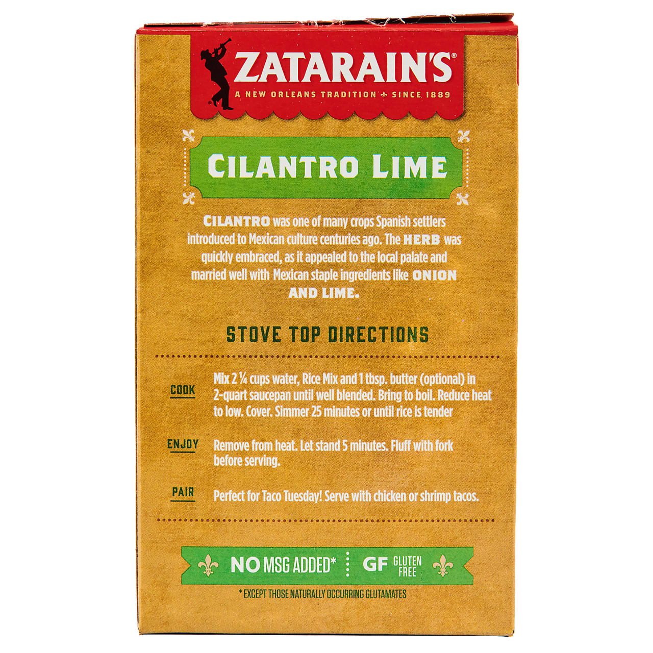Zatarain's Cilantro Lime Rice is made with long grain rice, real lime juice, cilantro and garlic. It's a convenient way to bring restaurant-inspired flavor to your table. Serve as a base for rice bowls or with Taco Tuesday meals, like chicken or shrimp tacos. For a quick & easy filling for burritos, cook 1 lb. ground beef and add to the rice. Or, jazz it up by stirring in chopped tomato or onion. With our 8-pack in your pantry, Cilantro Lime Rice will be your new favorite side dish or meal starter for Mexican dinners.