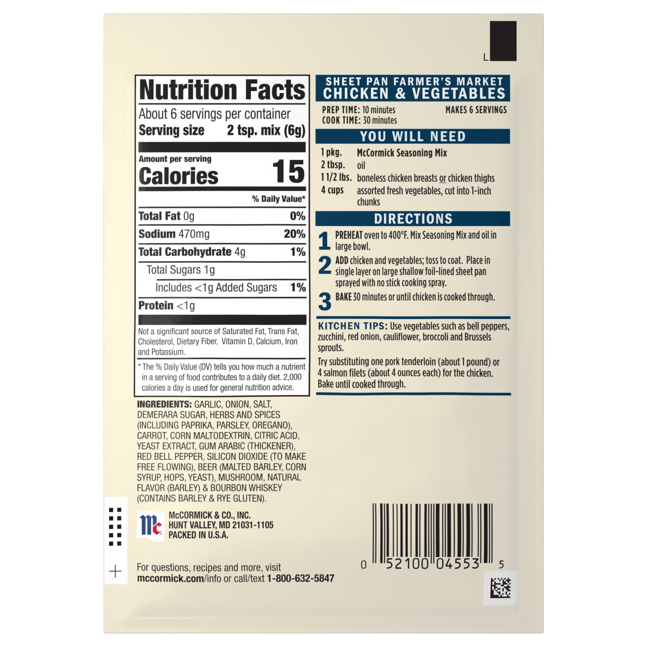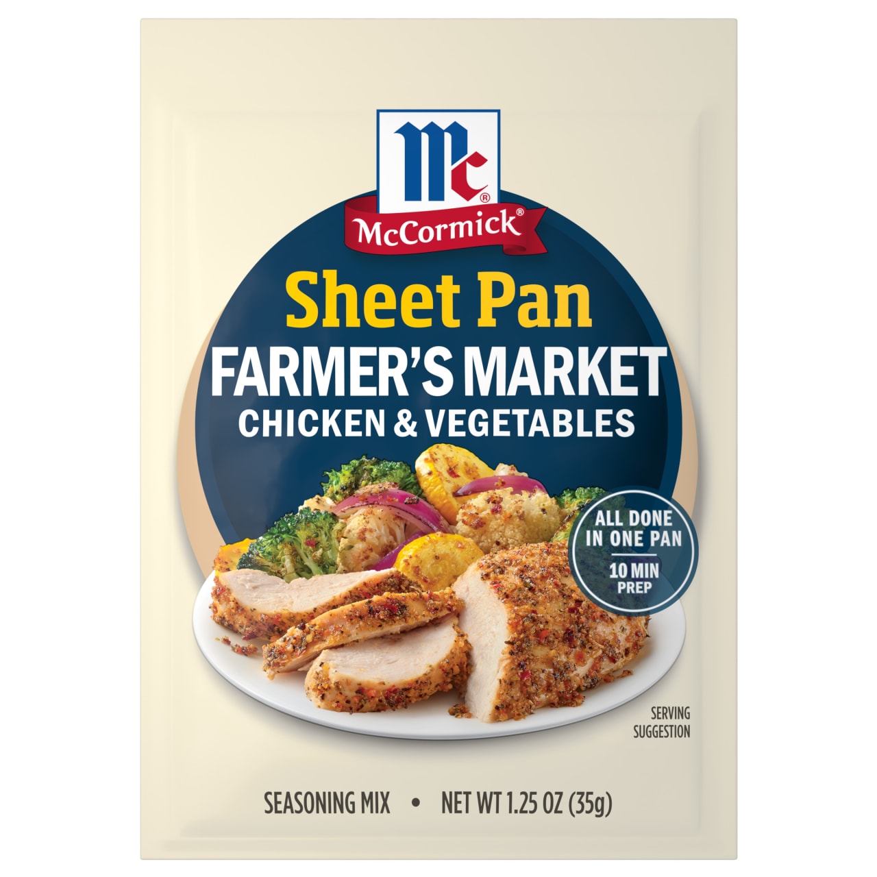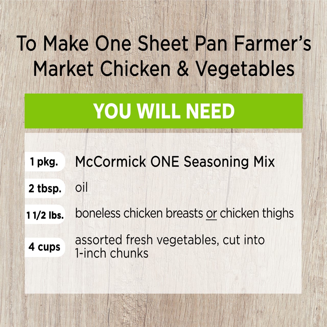 Highlight the best of the season's produce with McCormick One Sheet Pan Farmer's Market Chicken and Vegetables. This versatile seasoning mix plays well with whatever vegetables you have on hand, cr....