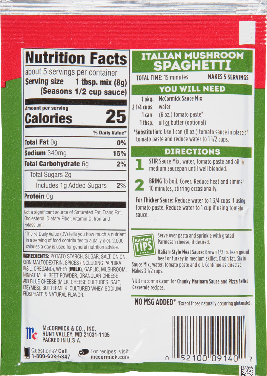 Spaghetti night made easy with an unforgettable tomato sauce made with a combination of mushrooms, garlic, basil and blue cheese. With McCormick Italian Mushroom Spaghetti Sauce Seasoning Mix, a pasta sauce with the authentic Italian flavor you crave is ready in 15 minutes. Our convenient sauce mix is crafted with McCormick herbs & spices and contains no artificial flavors or added MSG*, so you can it feel good about serving it to your family. All you need is a 6-ounce can of tomato paste. Add ground beef or turkey if you prefer a hearty meat sauce. Simmer for 10 minutes and it's ready to toss with spaghetti or your favorite pasta. (Prep Tip: Start the water for the pasta before you do anything else!) *Except those naturally occurring glutamates.