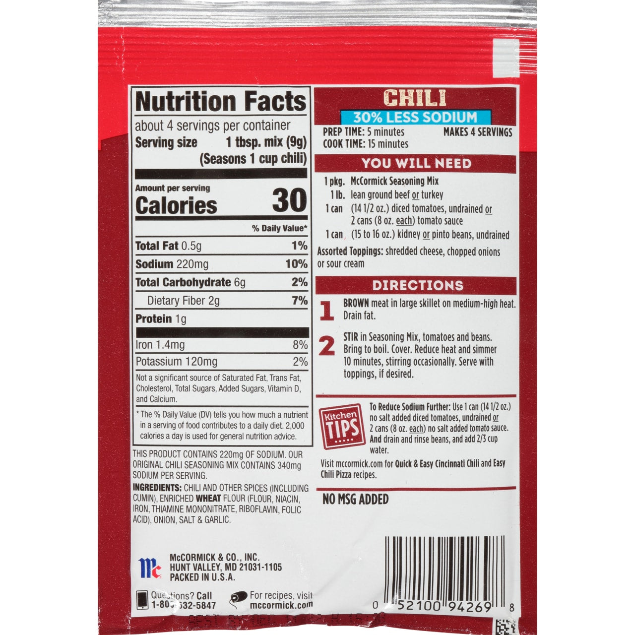 What's McCormick 30% Less Sodium Chili Seasoning Mix all about? Great tasting chili with less sodium! With 30% less sodium and no added MSG or artificial flavors, you can feel good about serving your family the best. It's blended with McCormick spices, including chili pepper, onion and garlic. Mix with your favorite beef or turkey chili recipe for a quick weeknight meal that will have the whole table craving seconds.