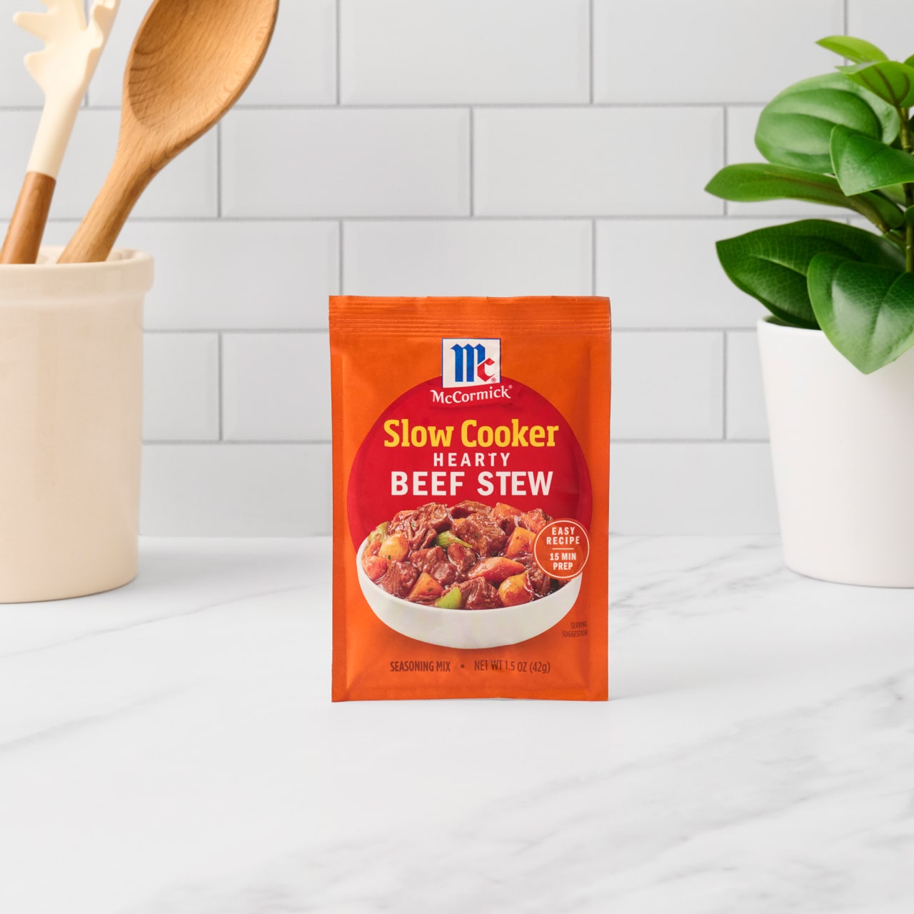 To Prepare McCormick Slow Cooker Hearty Beef Stew Seasoning Mix in a Slow Cooker: Place 2 lb. beef stew meat, trimmed and cut into 1-inch cubes, and 5 cups cut-up fresh vegetables, such as carrots, celery, onions, and potatoes, in slow cooker. Mix Seasoning Mix and 1 1/3 cups water in bowl until blended. Pour over beef and vegetables; toss to coat well. Cover. Cook 8 hours on LOW or 4 hours on HIGH. Stir before serving. SLOW COOKER TIP: For best results, do not remove cover while cooking._x000D_To Prepare McCormick Slow Cooker Hearty Beef Stew Seasoning Mix in an Electric Pressure Cooker: Mix Seasoning Mix and 1 1/3 cups water in bowl until blended; set aside. Heat 1 tbsp. oil on SAUTÉ function. Place 2 lb. beef stew meat, trimmed and cut into 1-inch cubes, in pot. Stir and cook 5 minutes or until lightly browned, stirring once. Add 5 cups cut-up fresh vegetables, such as carrots, celery, onions, and potatoes. Pour in seasoning mixture. Close lid. Set VALVE to SEAL. Set to cook for 30 minutes on MEAT/STEW function or until meat and vegetables are tender. When done, quick-release the pressure before opening. Open the lid once pressure inside the pot is completely released. (Check manufacturer’s manual for safe operating directions.) Makes 8 servings.