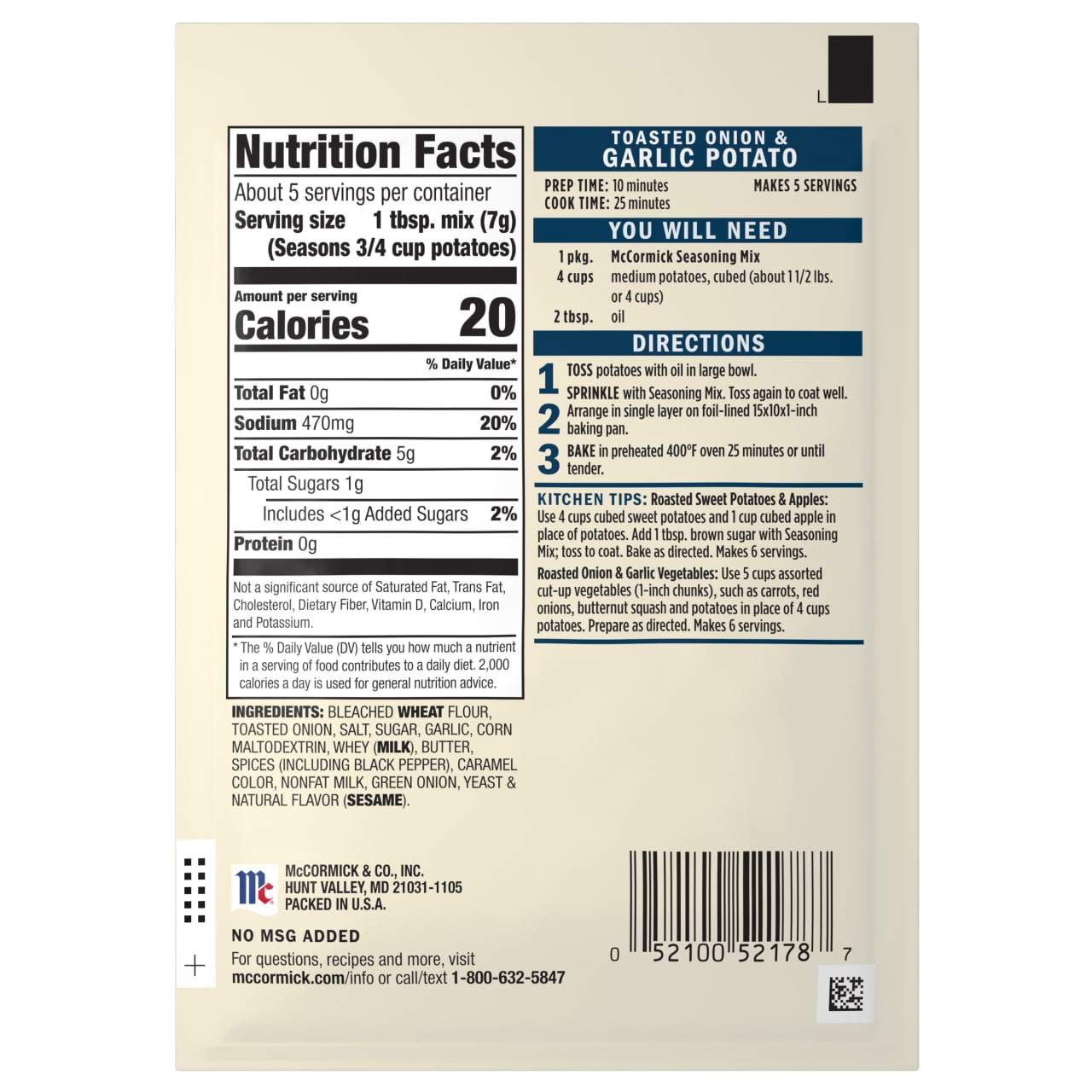 Take potatoes to the next level with McCormick Toasted Onion & Garlic Potato Seasoning Mix! Family meals will never be the same once these zesty potatoes make their debut at the dinner table. ....
