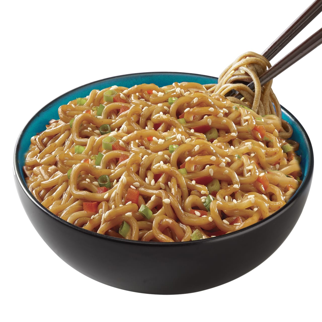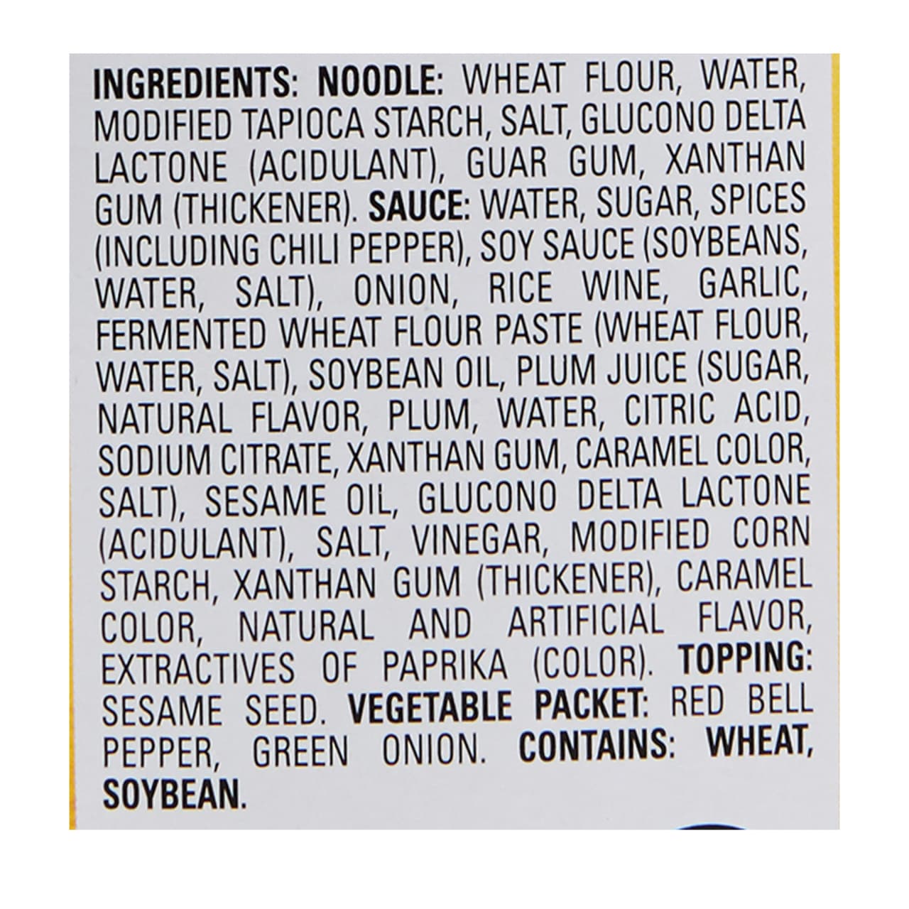 INGREDIENTS: Noodle: Water, Modified Tapioca Starch, Salt, Glucono Delta Lactone (Acidulant), Guar Gum, Xanthan Gum (Thickener). Sauce: Water, Sugar, Spices (Including Chili Pepper), Soy Sauce (Soybeans, Water, Salt), Onion, Rice Wine, Garlic, Fermented Wheat Flour Paste (Wheat Flour, Water, Salt), Soybean Oil, Plum Juice (Sugar, Natural Flavor, Plum, Water, Citric Acid, Sodium Citrate, Xanthan Gum, Caramel Color, Salt), Sesame Oil, Glucono Delta Lactone (Acidulant), Salt, Vinegar, Modified Corn Starch, Xanthan Gum (Thickener), Caramel Color, Natural and Artificial Flavor, Extractives of Paprika (Color). Topping: Sesame Seed. Vegetable Packet: Red Bell Pepper, Green Onion. Contains: Wheat, Soy.