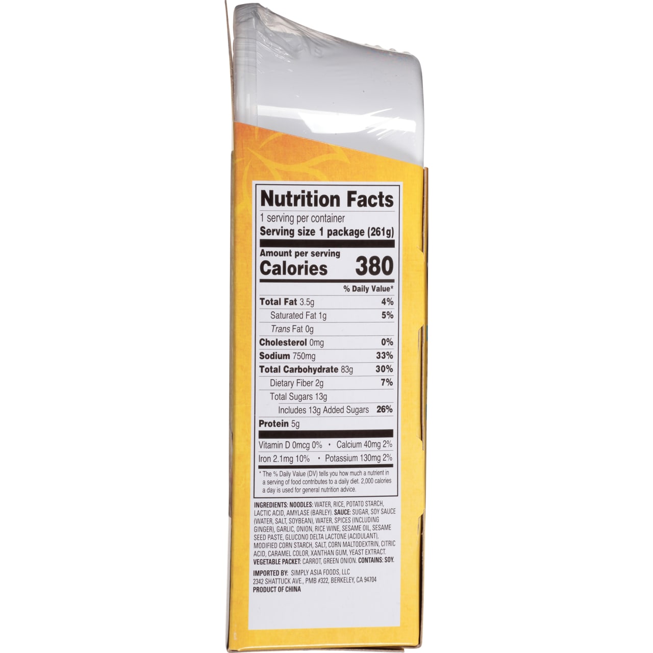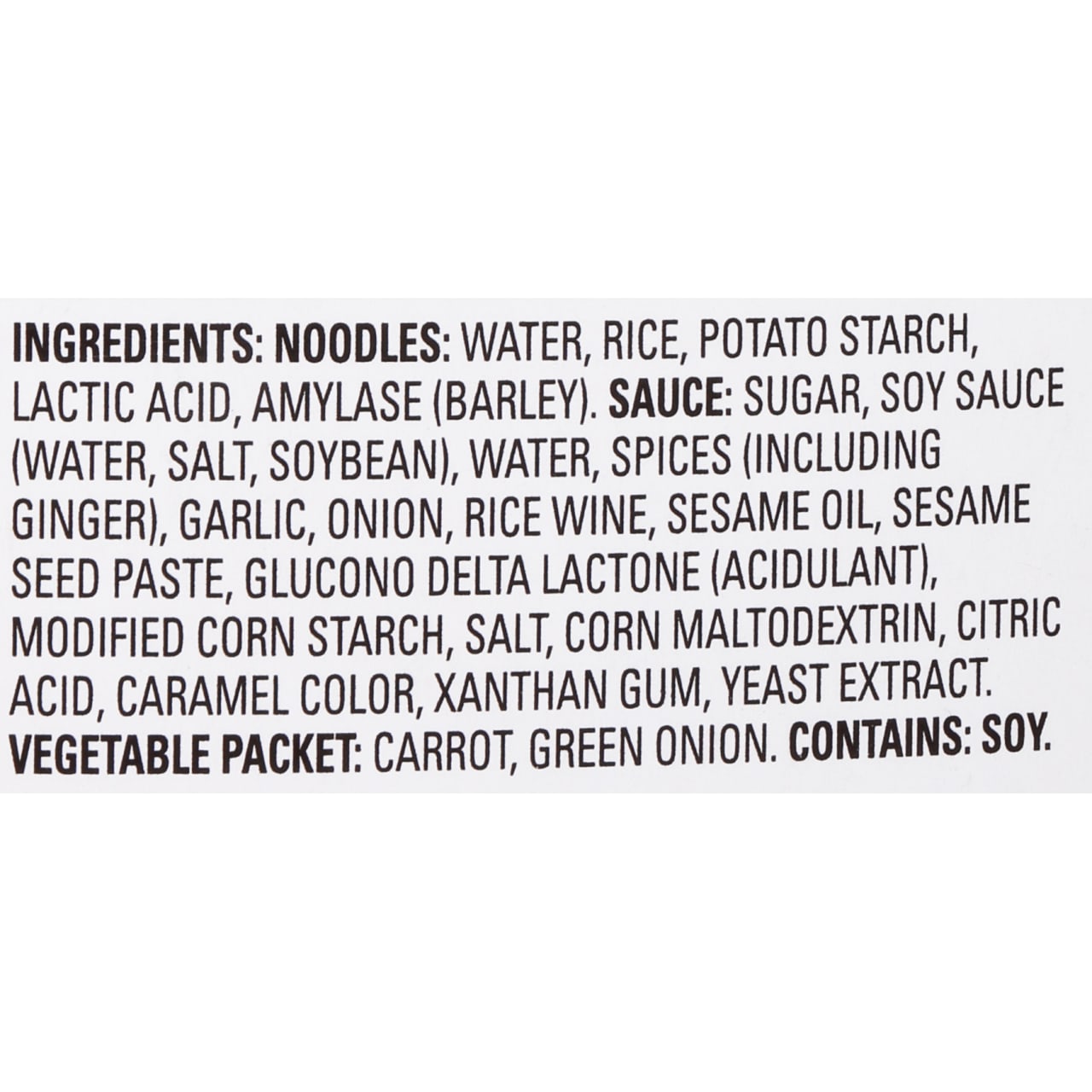 INGREDIENTS: Noodles: Water, Rice, Potato Starch, Lactic Acid, Amylase (Barley). Sauce: Sugar, Soy Sauce (Water, Salt, Soybean), Water, Spices (Including Ginger), Garlic, Onion, Rice Wine, Sesame Oil, Sesame Seed Paste, Glucono Delta Lactone (Acidulant), Modified Corn Starch, Salt, Corn Maltodextrin, Citric Acid, Caramel Color, Xanthan Gum, Yeast Extract. Vegetable Packet: Carrot, Green Onion. Contains: Soy.