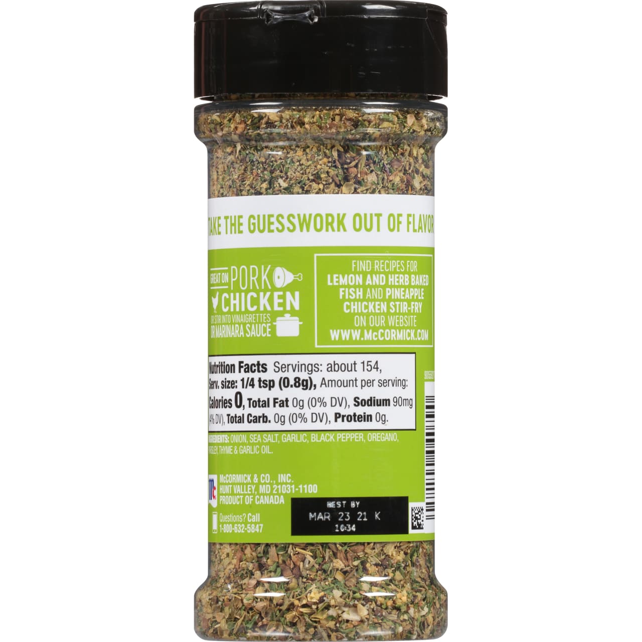 Reach for McCormick Garlic, Herb and Black Pepper and Sea Salt All Purpose Seasoning any time you want to boost the flavor of your everyday dishes. This goes-with-everything seasoning is great on pork and chicken or stir into vinaigrettes and marinara sauce. A little savory, a little spicy, and a whole lot of herb, this versatile seasoning is a must-have for every spice rack. We've taken the care to blend herbs and spices like oregano, thyme and black pepper along with sea salt, garlic and onion. Shake it onto meat or vegetables before grilling or roasting; add to meatloaf or slow cooker dishes; use to season sides like potatoes or cauliflower. Keep it at-the-ready (and have an extra jar in your pantry) to take your everyday meals to the next level!