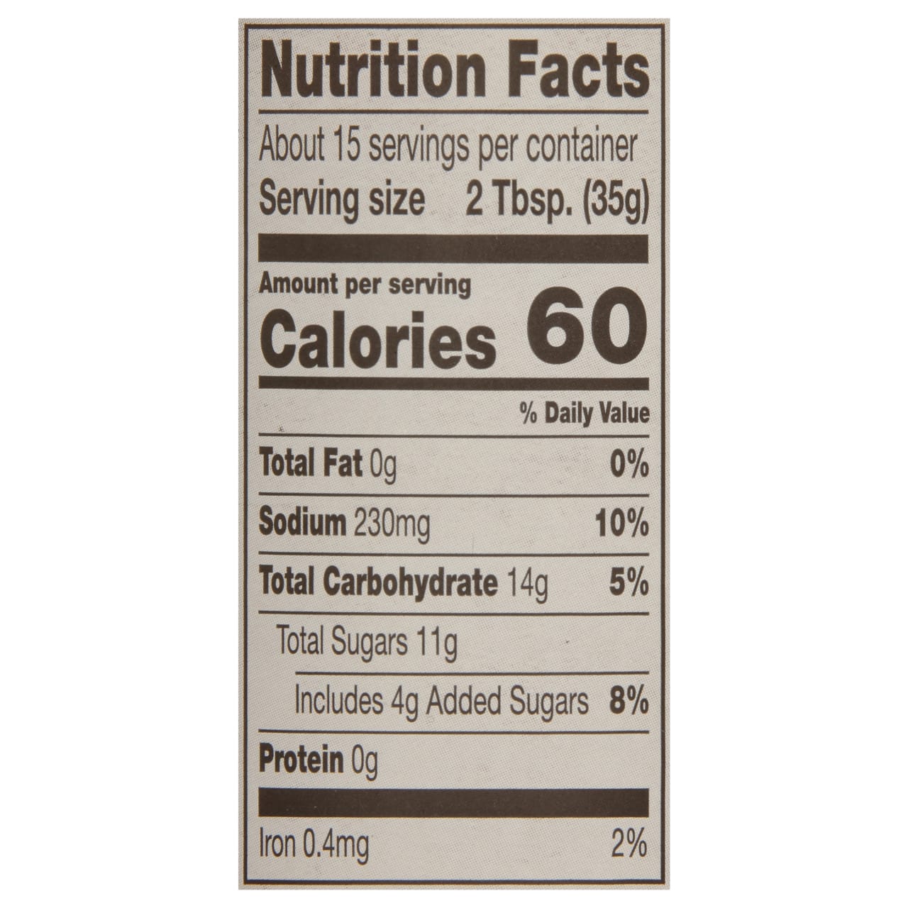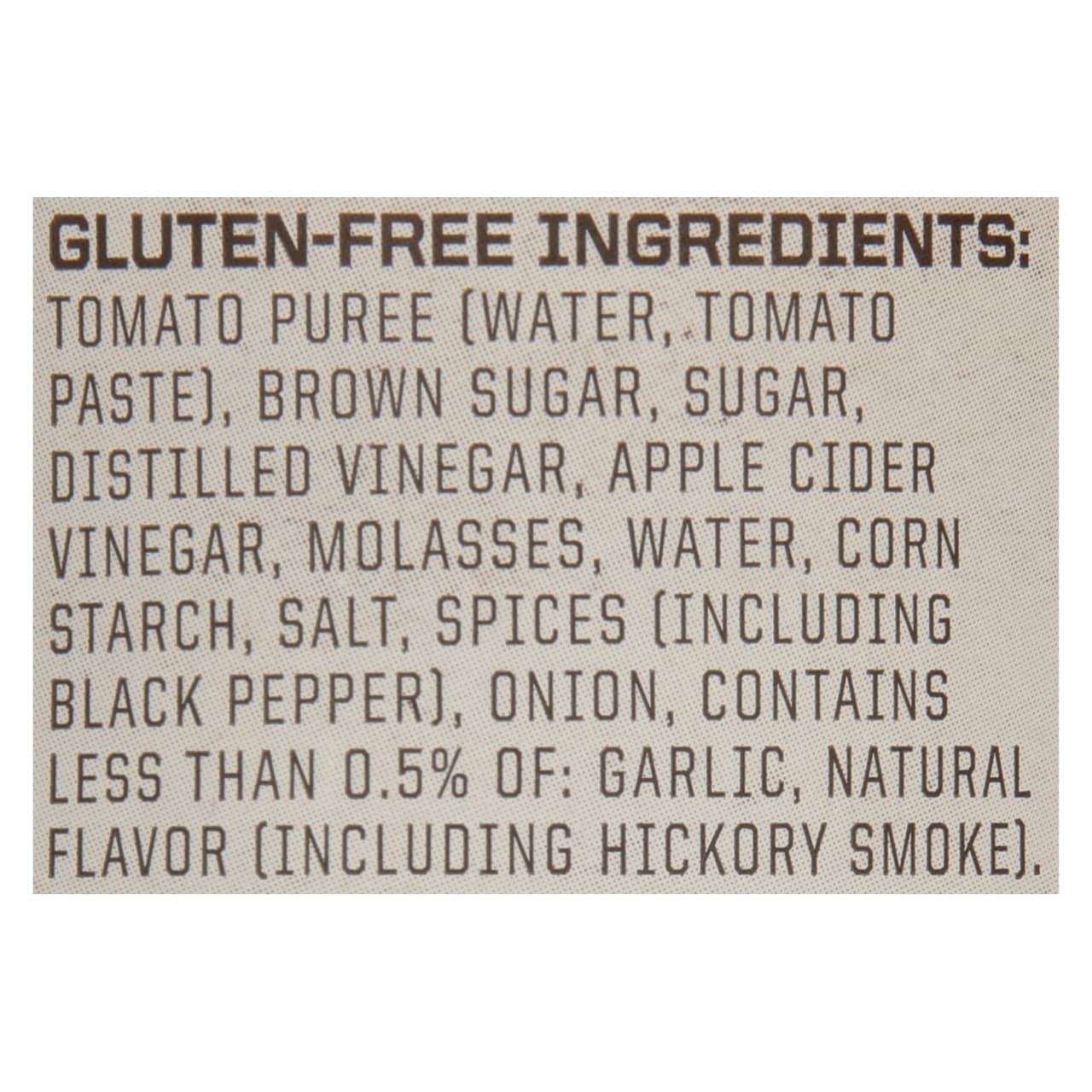 INGREDIENTS: Gluten-Free Ingredients: Tomato Puree (Water, Tomato Paste), Brown Sugar, Sugar, Distilled Vinegar, Apple Cider Vinegar, Molasses, Water, Corn Starch, Salt, Spices (Including Black Pepper), Onion, Contains Less than 0.5% of: Garlic, Natural Flavor (Including Hickory Smoke).