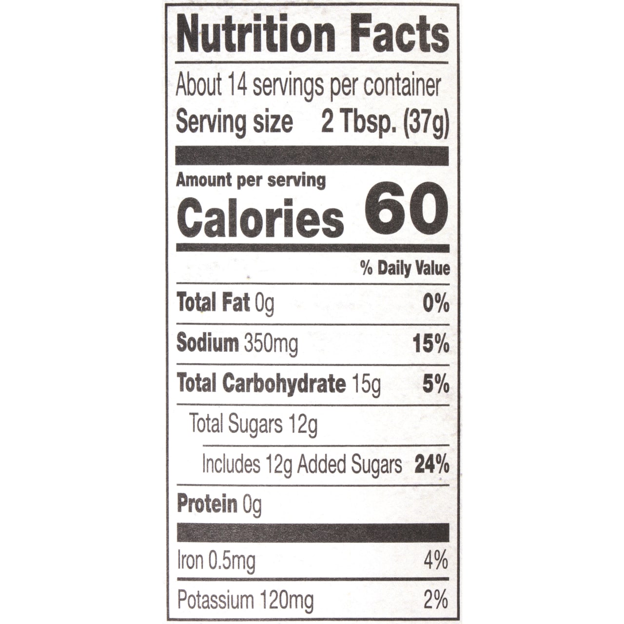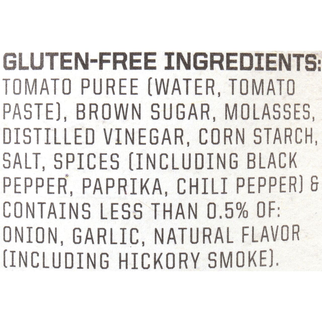 INGREDIENTS: Tomato Puree (Water, Tomato Paste), Brown Sugar, Molasses, Distilled Vinegar, Corn Starch, Salt, Spices (Including Black Pepper, Paprika, Chili Pepper) & Contains Less than 0.5% of: Onion, Garlic, Natural Flavor (Including Hickory Smoke).