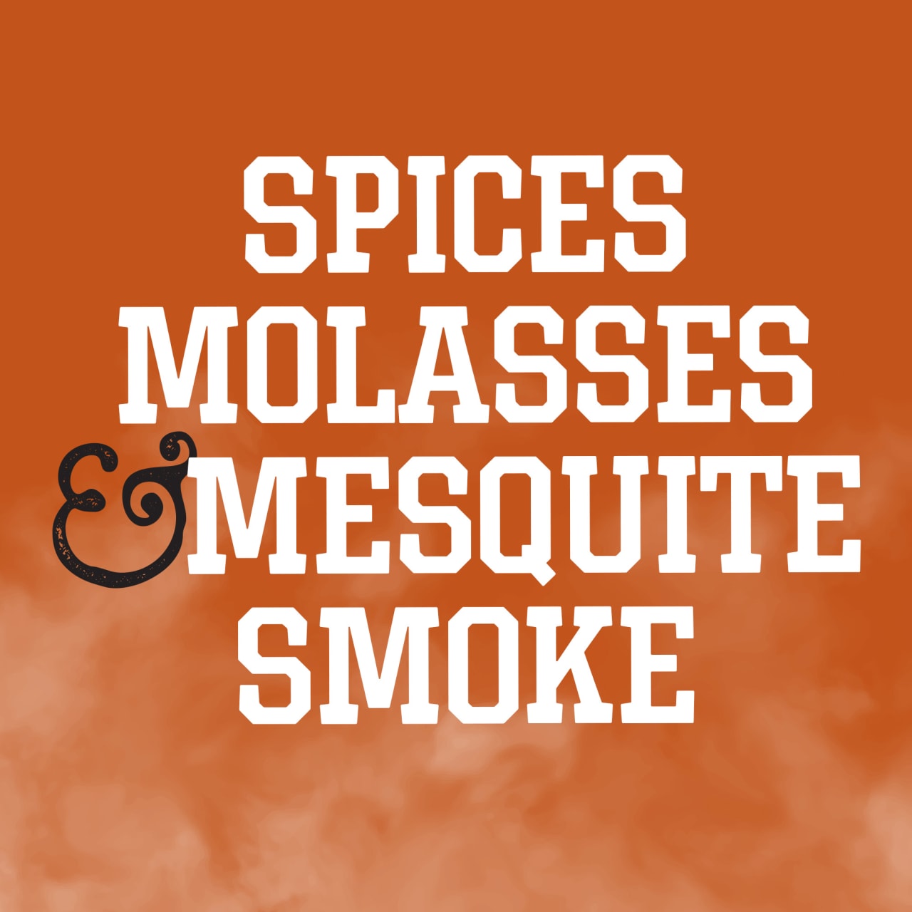 A blend of black & red pepper, molasses, garlic, paprika and mesquite smoke