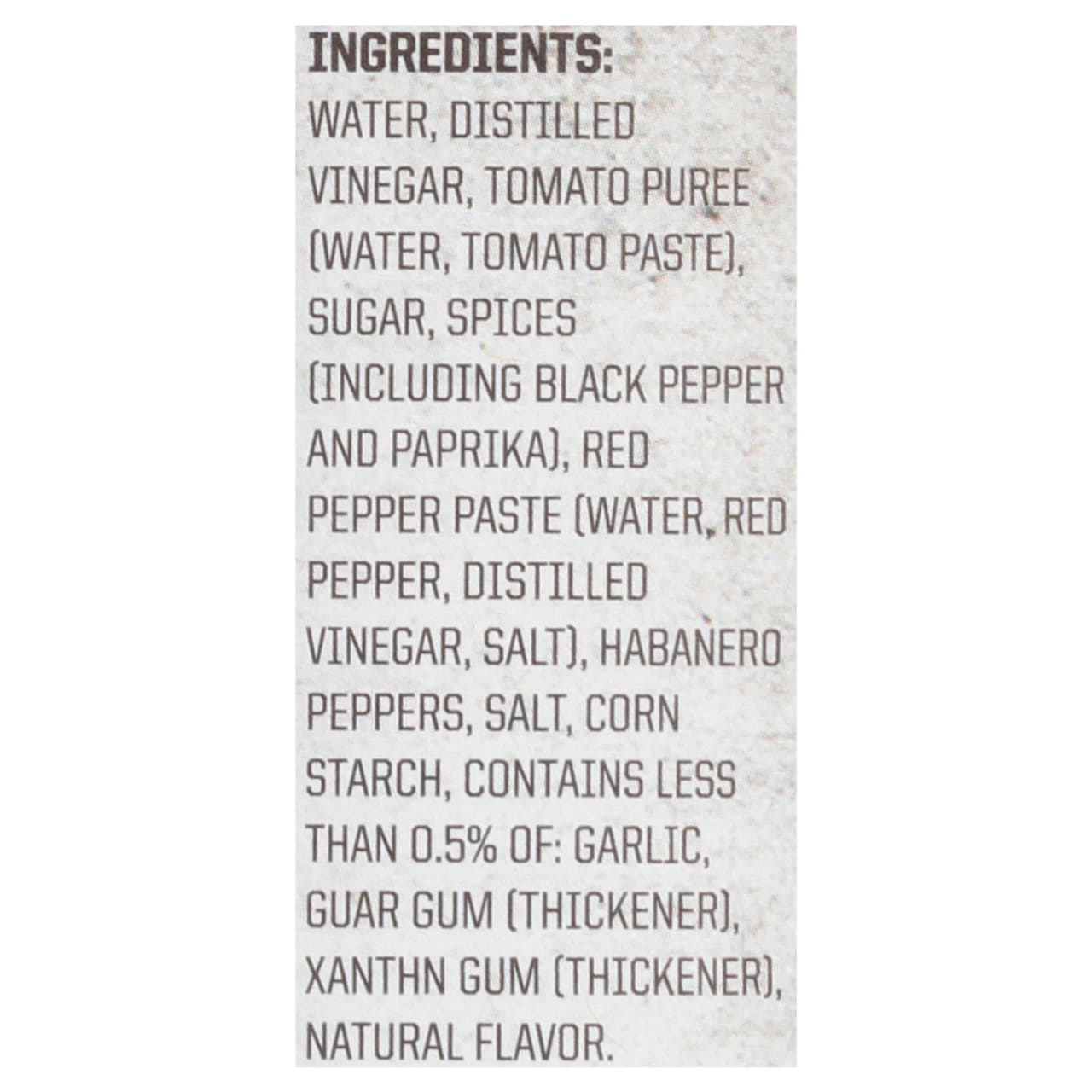 INGREDIENTS: Water, Distilled Vinegar, Tomato Puree (Water, Tomato Paste), Sugar, Spices (Including Black Pepper and Paprika), Red Pepper Paste (Water, Red Pepper, Distilled Vinegar, Salt), Habanero Peppers, Salt, Corn Starch, Contains Less than 0.5% of: Garlic, Guar Gum (Thickener), Xanthan Gum (Thickener), Natural Flavor.