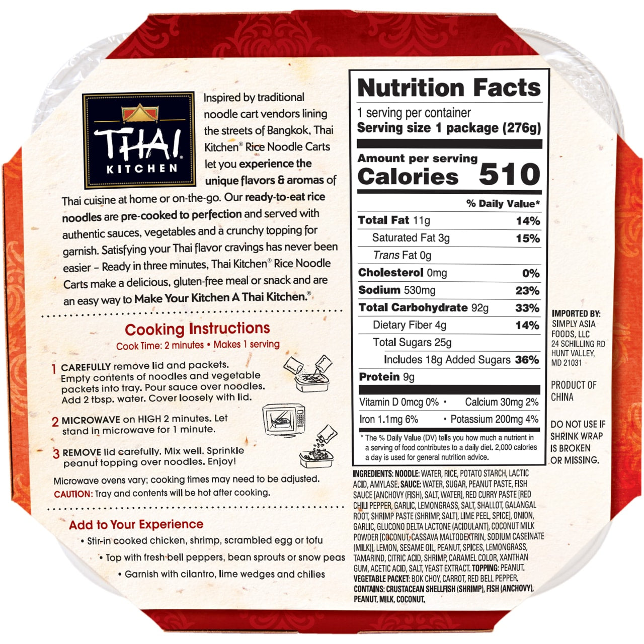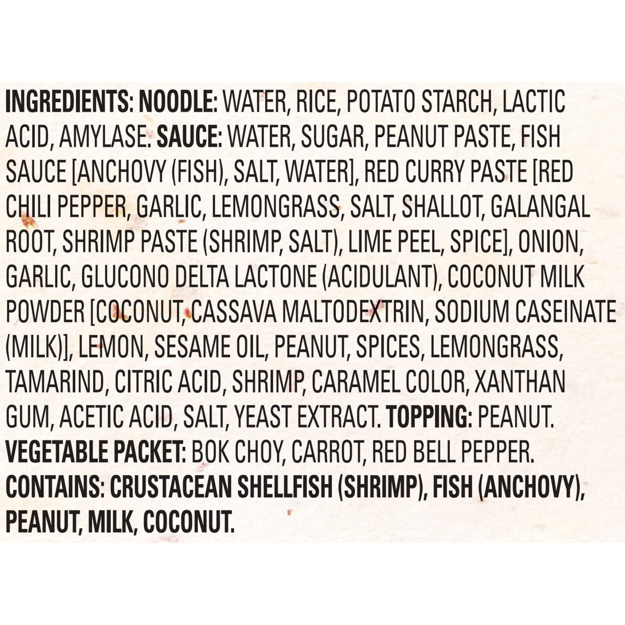 INGREDIENTS: Noodle: Water, Rice, Potato Starch, Lactic Acid, Amylase. Sauce: Water, Sugar, Peanut Paste, Fish Sauce (Anchovy, Water, Salt, Sugar), Red Curry Paste (Chili Pepper, Garlic, Lemongrass, Salt, Shallot, Galangal, Shrimp Paste, Thai Lime, Pepper), Onion, Garlic, Glucono Delta-Lactone (Acidulant), Coconut Milk Powder (Extractives of Coconut, Corn Maltodextrin, Sodium Caseinate [Milk]), Lemon, Sesame Oil, Acetic Acid, Peanut, Spices, Lemongrass, Tamarind Paste (Tartaric Acid, Succinic Acid, Malic Acid, Tamarind Seed Gum, Pectin), Xanthan Gum, Citric Acid, Caramel Color, Yeast Extract. Dehydrated Vegetables: Bok Choy, Carrot, and Red Bell Pepper. Topping: Peanut. Contains: Shrimp, Peanuts, Milk, Anchovy.