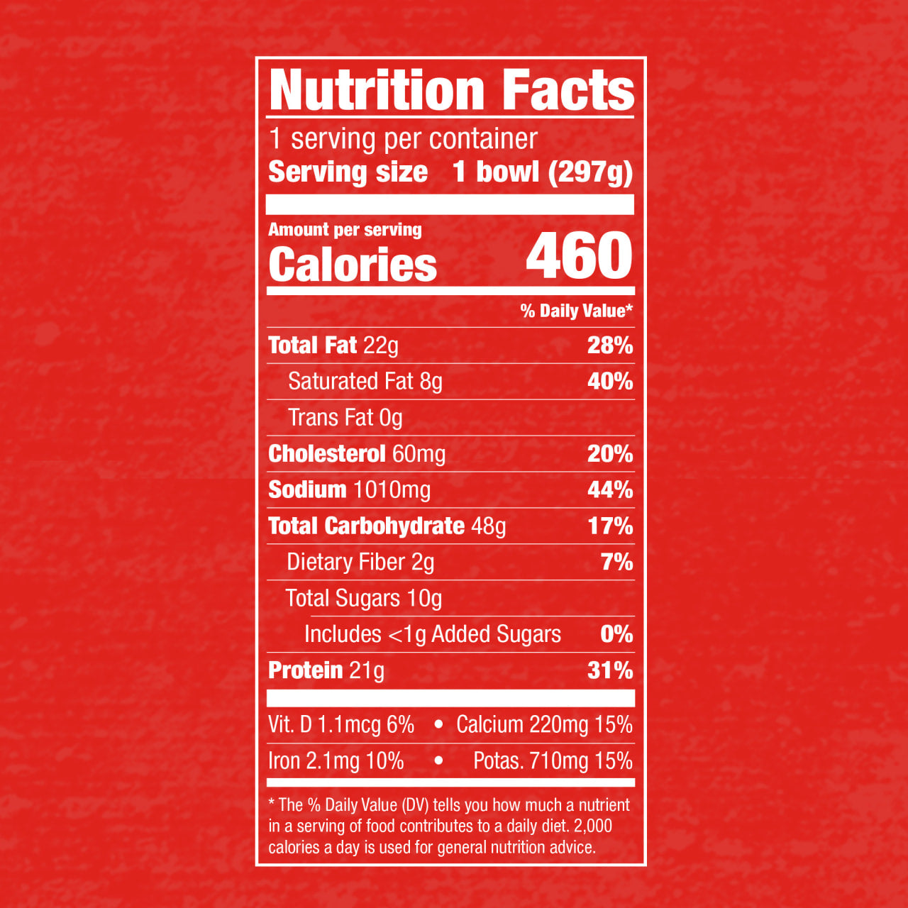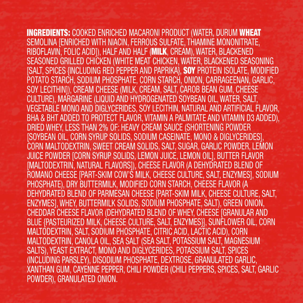 INGREDIENTS: Cooked Enriched Macaroni Product (Water, Durum Wheat Semolina [Enriched with Niacin, Ferrous Sulfate, Thiamine Mononitrate, Riboflavin, Folic Acid]), Half and Half (Milk, Cream), Water, Blackened Seasoned Grilled Chicken (White Meat Chicken, Water, Blackened Seasoning [Salt, Spices {Including Red Pepper and Paprika}, Soy Protein Isolate, Modified Potato Starch, Sodium Phosphate, Corn Starch, Onion, Carrageenan, Garlic, Soy Lecithin]), Cream, Cream Cheese ( Milk, Cream, Salt, Carob Bean Gum, Cheese Culture), Margarine (Liquid and Hydrogenated Soybean Oil, Water, Salt, Vegetable Mono and Diglycerides, Soy Lecithin, Natural and Artificial Flavor, BHA & BHT Added to Protect Flavor, Vitamin A Palmitate and Vitamin D3 Added), Dried Whey, Less Than 2% of: Heavy Cream Sauce (Shortening Powder [Soybean Oil, Corn Syrup Solids, Sodium Caseinate and Mono and Diglycerides], Corn Maltodextrin, Sweet Cream Solids, Salt, Sugar, Garlic Powder, Lemon Juice Powder [Corn Syrup Solids, Lemon Juice, Lemon Oil], Butter Flavor (Maltodextrin, Natural Flavors]), Cheese Flavor (a Dehydrated Blend of Romano Cheese [Part Skim Cow's Milk, Cheese Culture, Salt, Enzymes], Sodium Phosphate, Salt), Dry Buttermilk, Modified Corn Starch, Cheese Flavor (A Dehydrated Blend of Parmesan Cheese [Park Skim Milk, Cheese Culture, Salt, Enzymes), Whey, Buttermilk Solids, Sodium Phosphate, Salt), Green Onion, Cheddar Cheese Flavor (Dehydrated Blend of Whey, Cheese [Granular and Blue {Pasteurized Milk, Cheese Culture, Salt, Enzymes}], Sunflower Oil, Corn Maltodextrin, Salt, Sodium Phosphate, Citric Acid, Lactic Acid), Corn Maltodextrin, Canola Oil, Sea Salt (Sea Salt, Potassium Salt, Magnesium Salts), Yeast Extract, Mono and Diglycerides, Potassium Salt, Spices (Including Parsley), Disodium Phosphate, Dextrose, Granulated Garlic, Xanthan Gum, Cayenne Pepper, Chili Powder (Chili Peppers, Spices, Salt, Garlic Powder), Granulated Onion. Contains: Wheat, Soy, Milk.