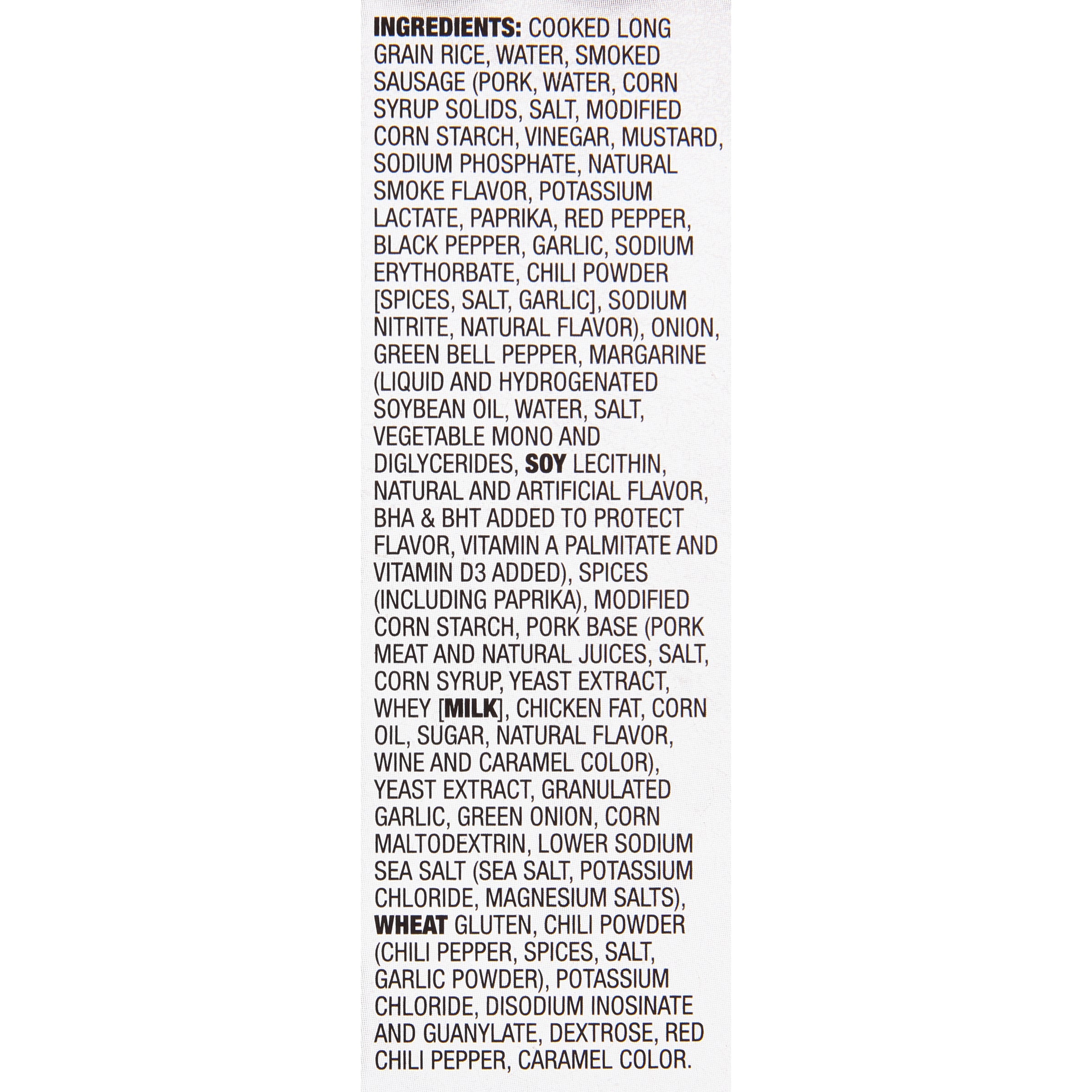INGREDIENTS: Cooked Long Grain Rice, Water, Smoked Sausage (Pork, Water, Corn Syrup Solids, Salt, Modified Corn Starch, Vinegar, Mustard, Sodium Phosphate, Natural Smoke Flavor, Potassium Lactate, Paprika, Red Pepper, Black Pepper, Garlic, Sodium Erythorbate, Chili Powder [Spices, Salt, Garlic], Sodium Nitrite, Natural Flavor), Onion, Green Bell Pepper, Margarine (Liquid and Hydrogenated Soybean Oil, Water, Salt, Vegetable Mono and Diglycerides, Soy Lecithin, Natural and Artificial Flavor, BHA & BHT Added to Protect Flavor, Vitamin A Palmitate and Vitamin D3 Added), Spices (Including Paprika), Modified Corn Starch, Pork Base (Pork Meat and Natural Juices, Salt, Corn Syrup Extract, Yeast Extract, Whey [Milk], Chicken Fat, Corn Oil, Sugar, Natural Flavor, Wine and Caramel Color), Yeast Extract, Granulated Garlic, Green Onion, Corn Maltodextrin, Lower Sodium Sea Salt (Sea Salt, Potassium Chloride, Magnesium Salts), Wheat Gluten, Chili Powder (Chili Pepper, Spices, Salt, Garlic Powder), Potassium Chloride, Disodium Inosinate and Guanylate, Dextrose, Red Chili Pepper, Caramel Color. Contains: Wheat, Soy, Milk.