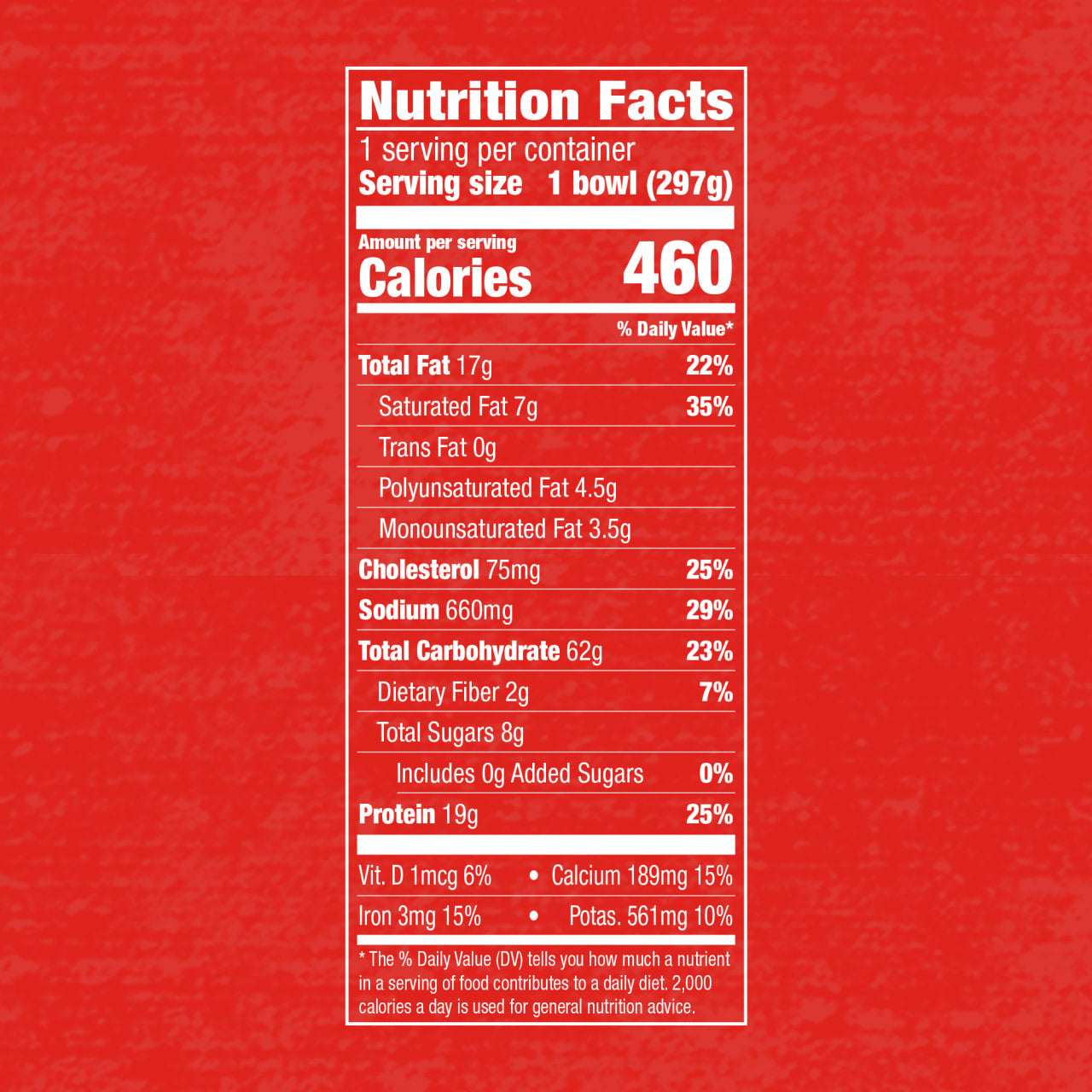 INGREDIENTS: Cooked Enriched Macaroni Product (Water, Durum Wheat Semolina [Niacin, Ferrous Sulfate, Thiamine Mononitrate, Riboflavin, Folic Acid]), Shrimp (Shrimp, Salt, Sodium Tripolyphosphate), Water, Half and Half (Milk, Cream), Cream Cheese (Milk, Cream, Salt, Carob Bean Gum, Cheese Culture), Margarine (Liquid and Hydrogenated Soybean Oil, Water, Salt, Vegetable Mono and Diglycerides, Soy Lecithin, Natural and Artificial Flavor, BHA & BHT Added to Protect Flavor, Vitamin A Palmitate and Vitamin D3 Added), Sweet Dairy Whey, Heavy Cream Sauce (Shortening Powder [Soybean Oil, Corn Syrup Solids, Sodium Caseinate, Mono & Diglycerides], Corn Maltodextrin, Sweet Cream Solids, Salt, Sugar, Garlic Powder, Lemon Juice Powder [Corn Syrup Solids, Lemon Juice, Lemon Oil], Natural Butter Flavor), Cheese Flavor (Dehydrated Blend of Romano Cheese [Part-Skim Cow's Milk, Cheese Culture, Salt, Enzymes], Sodium Phosphate), Dry Buttermilk, Modified Corn Starch, Cheese Flavor (Dehydrated Blend of Parmesan Cheese [Part-Skim Milk, Cheese Culture, Salt, Enzymes], Whey, Buttermilk Solids, Sodium Phosphate, Salt), Canola Oil, Green Onion, Cheddar Cheese Flavor (Dehydrated Blend of Whey, Cheese [Granular and Blue {Pasteurized Milk, Cheese Culture, Salt, Enzymes}], Sunflower Oil, Corn Maltodextrin, Salt, Sodium Phosphate, Citric Acid, Lactic Acid), Corn Maltodextrin, Lower Sodium Sea Salt (Sea Salt, Potassium Chloride, Magnesium Salts), Yeast Extract, Mono and Diglycerides, Potassium Chloride, Parsley Flakes, Xanthan Gum, Spices, Disodium Phosphate, Dextrose, Granulated Garlic, Chili Powder (Chili Peppers, Spices, Salt, Garlic Powder), Granulated Onion. Contains: Shrimp, Wheat, Soy, Milk.