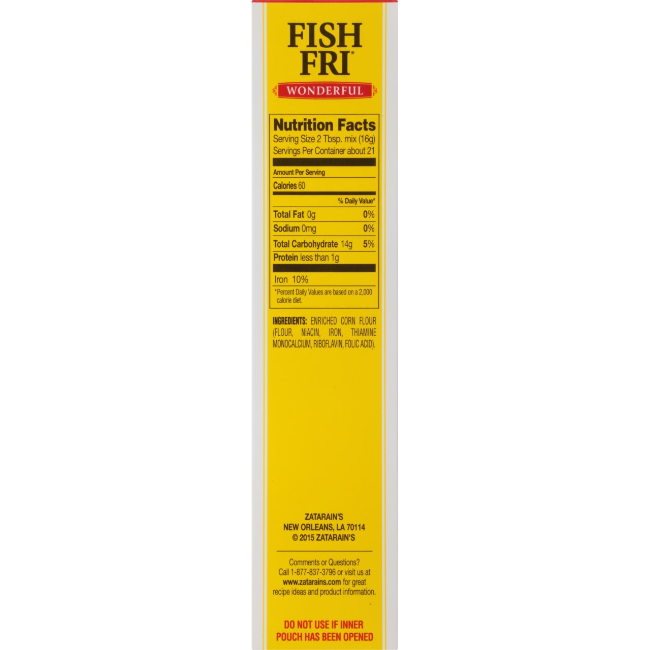 Pan Frying Directions: 1. Pour 1 inch of vegetable oil into large skillet. Heat oil to 350degF on medium heat. 2. Coat and fry fish as directed above. Baking Directions: 1. Brush 1 lb. fish fillets on both sides with oil. Pour Fish Fri onto plate. Roll fish in Fish Fri until evenly coated. Discard any remaining Fish Fri mixture on plate. 2. Place fish on shallow baking pan sprayed with no stick cooking spray. Spray on top of fish with cooking spray. 3. Bake in preheated 450degF oven 15 minutes or until fish flakes easily with a fork. Deep Frying Directions: 1. Fill deep fryer no more than 1/3 full with oil. Heat oil to 350degF on medium heat. 2. Pour Zatarain's Wonderful Fish Fri onto plate or into plastic bag. Use 1/2 cup Fish Fri per 1 lb fish. Roll or shake fish in Fish Fri until evenly coated. Discard any remaining Fish Fri mixture on plate or in plastic bag. 3. Fry fish, a few pieces at a time, in hot oil until light golden brown. Drain on paper towels. Note: For thicker coating, dip fish in 1/2 cup milk mixed with 1 lightly beaten egg, before rolling in Fish Fri.