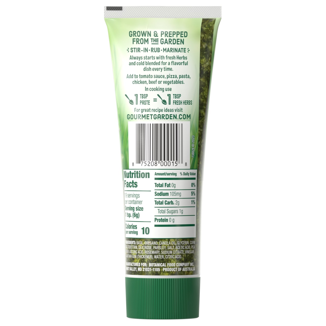 Put the pasta water on to boil! One squeeze of Gourmet Garden Italian Herbs Stir-In Paste and you'll be making Italian every night. No prep necessary- the herbs are ready to add classic Italian flavor to your dishes. Each squeezable tube features fresh herbs- basil, oregano and parsley –with the best flavor, color and aroma when it reaches your family's table. Add Italian herbs at the end of your cooking for robust Mediterranean flavor in everything from pasta and pizza to dressings, meatballs and more. Use 1 tablespoon of paste in place of 1 tablespoon of fresh herbs. Store refrigerated for weeks after opening.