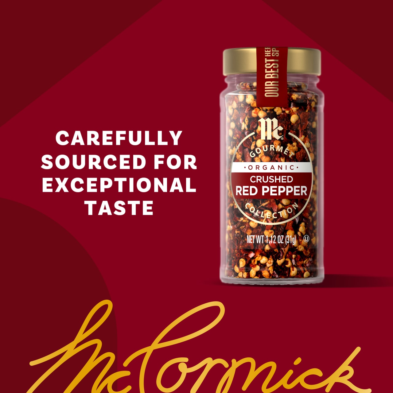 McCormick Gourmet Collection Organic Crushed Red Pepper is carefully sourced and flavor sealed for the most robust flavor possible. Elevate your cooking with bold heat, a sharp peppery bite, and in....