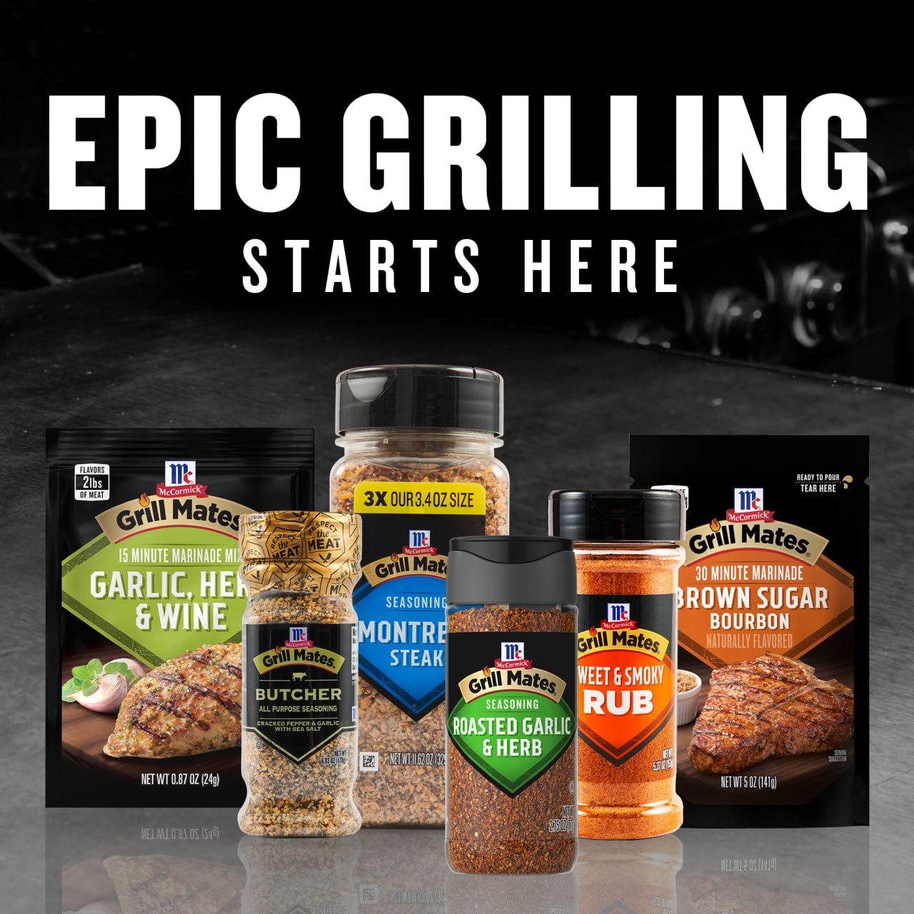 All it takes is flame, and McCormick Grill Mates Roasted Garlic & Herb Seasoning. This epic blend of spices includes onion, parsley, black pepper, coriander and roasted garlic. Shake or rub 2 t....