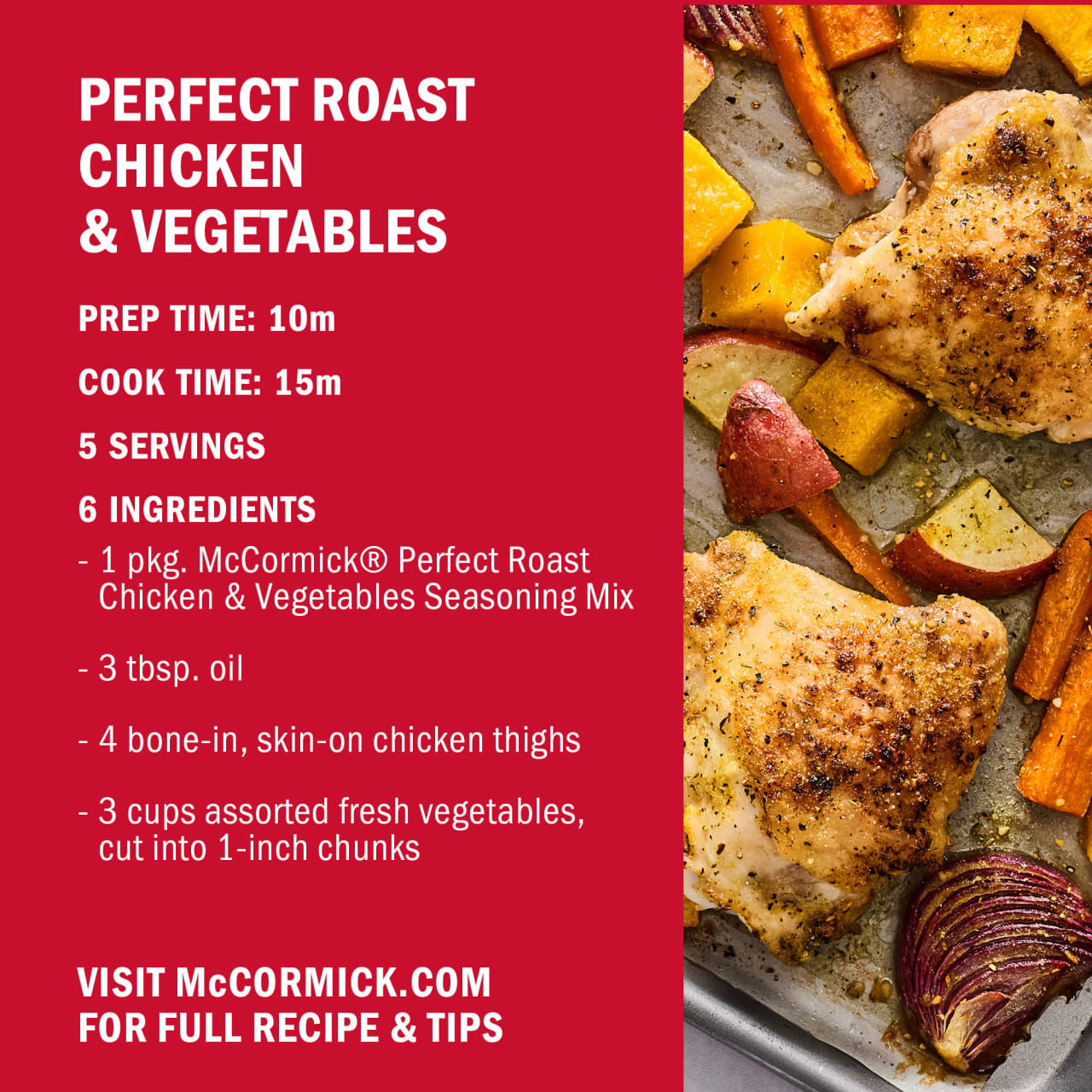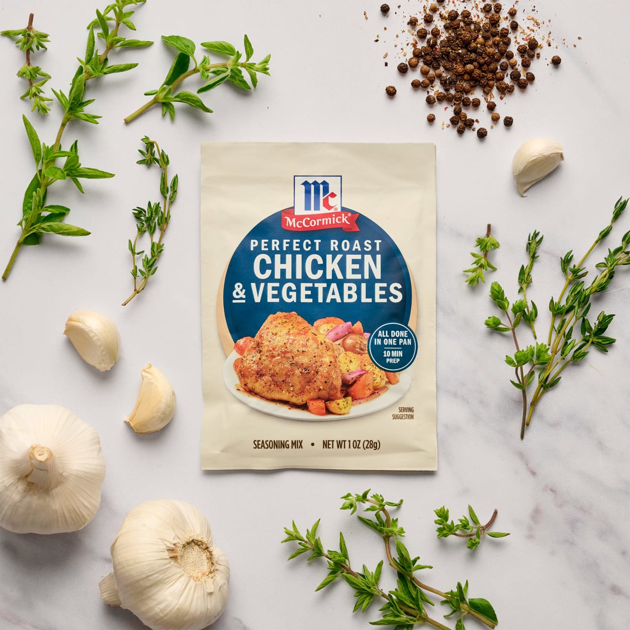 Make weeknight dinners a breeze with McCormick® Perfect Roast Chicken & Vegetables Seasoning Mix. This savory blend of garlic, black pepper, thyme, and other McCormick herbs and spices helps you roast juicy chicken and tender vegetables, all in one pan, with just 10 minutes of prep. What's for dinner? McCormick Perfect Roast Chicken & Vegetables Seasoning Mix has the answer. Just mix with oil, toss with bone-in or boneless chicken and fresh veggies like potatoes, carrots, or onions, and then roast to perfection. The beauty of this seasoning mix is that it works well with a variety of ingredients — as long as it's in your pantry, you have dinner covered!