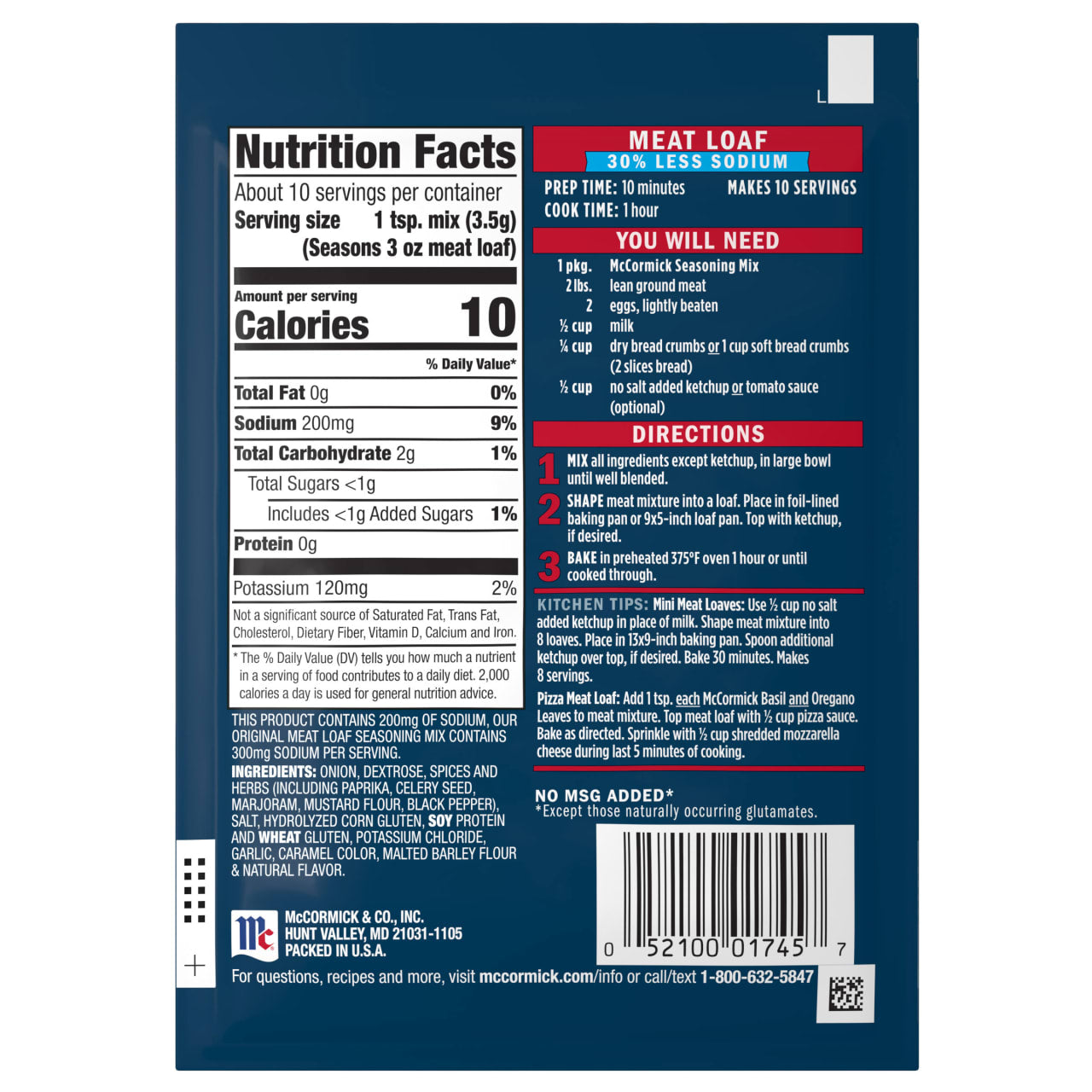McCormick 30% Less Sodium Meat Loaf Seasoning Mix is the secret ingredient to hearty, home-style meat loaf. Made with McCormick herbs & spices, no artificial flavors or added MSG*, and 30% less sodium than our original meat loaf mix!