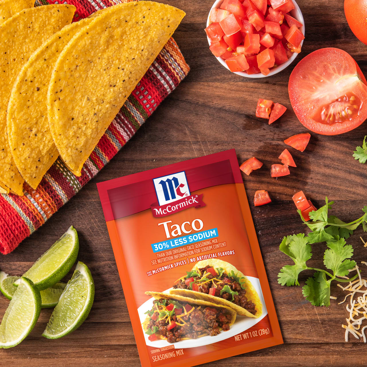 - VIBRANT TACO FLAVOR: With a mild heat – and 30% less sodium than McCormick Original Taco Seasoning Mix. Made with paprika, chili pepper, cumin, and onion for adding south-of-the-border zip to tacos and your favorite foods.