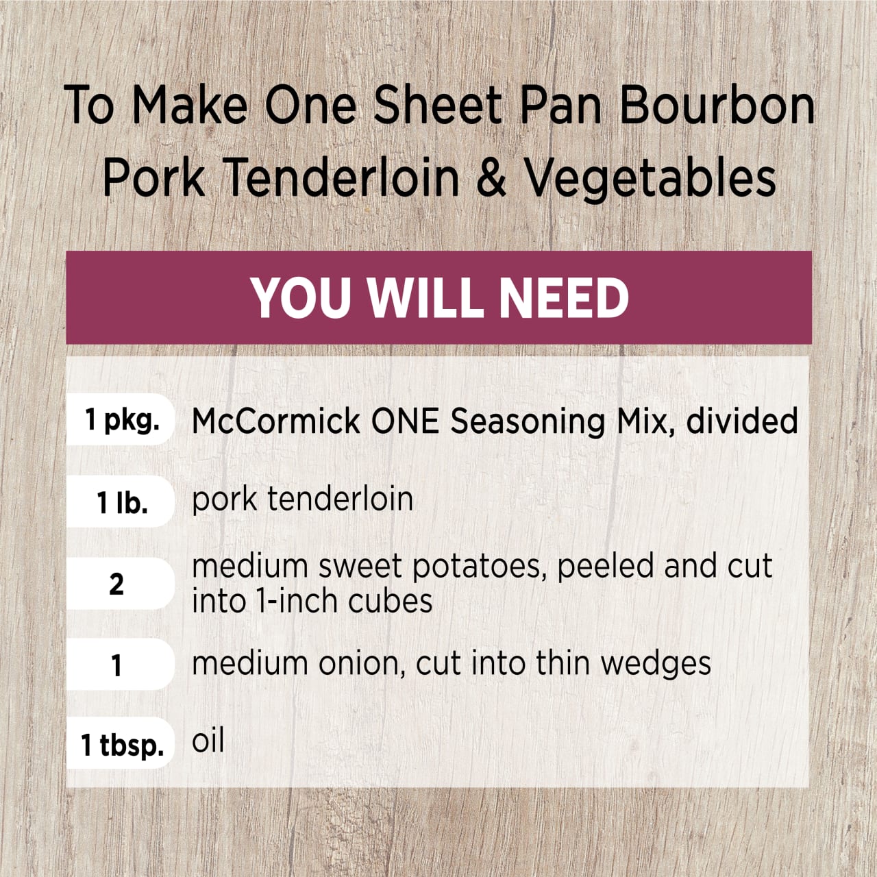 Craving a southern-inspired meal? Bourbon, brown sugar and garlic come together to create an addictively sweet and savory combination. McCormick One Sheet Pan Bourbon Pork Tenderloin and Vegetables makes it easy- from prep to clean-up. Use this convenient dry rub to coat both the meat and the vegetables on the pan for smoky, sweet flavor in every bite. We recommend roasting it up with sweet potatoes and onions, but choose any root veggie that you like. Pro tip: line the sheet pan with foil for easy clean-up. To make this one-pan meal, you will need: McCormick ONE Seasoning Mix, pork tenderloin, sweet potatoes, onion and oil.