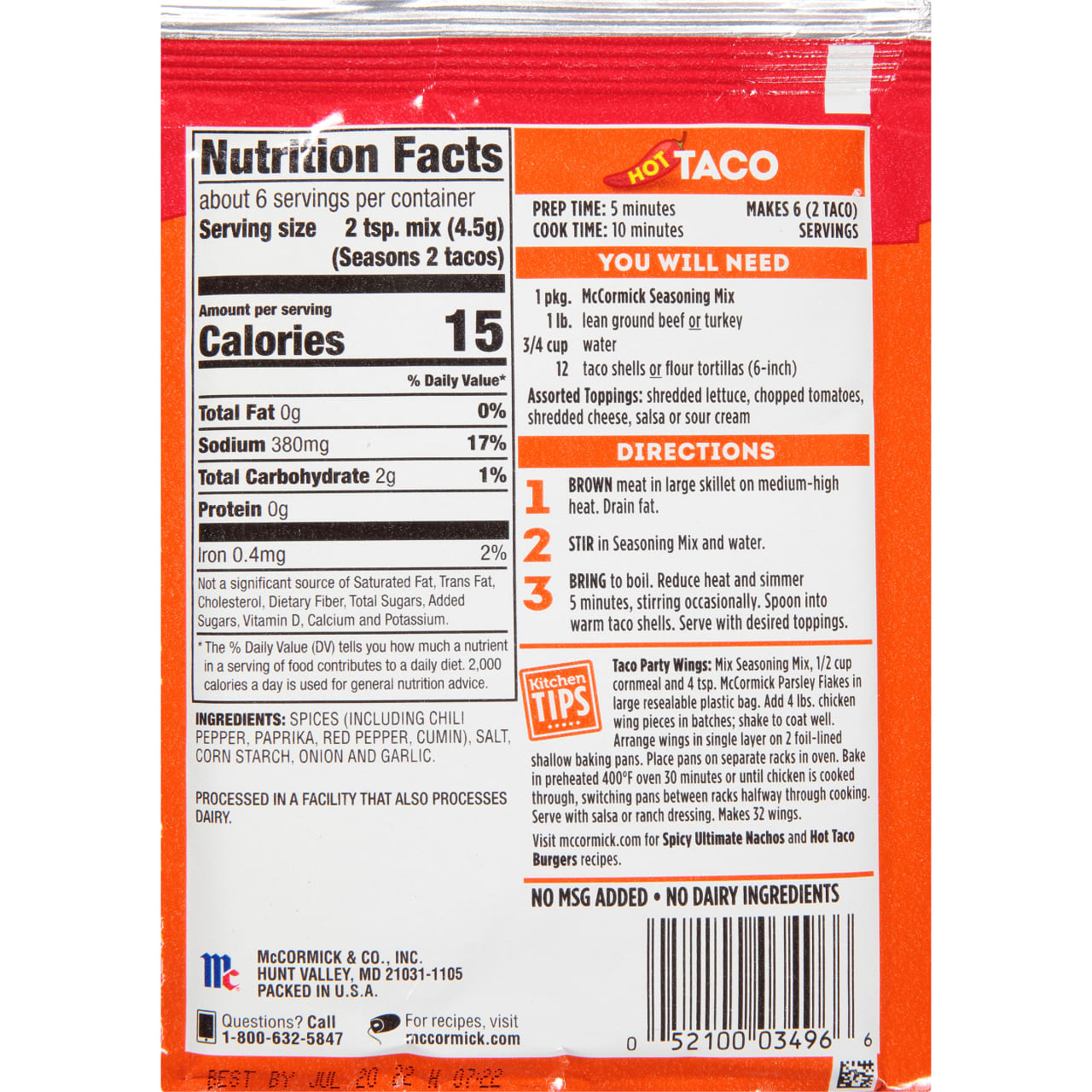 Treat your taste buds to a little fire! Made with chili peppers, cumin and cayenne, McCormick Hot Taco Seasoning Mix is a spicier, kicked-up version of our original Taco blend, ready to bring heat and flavor to beef, chicken or vegetarian tacos. Heat-lovers will go crazy for this signature blend of hot herbs and spices, ready for creating tasty, spicy taco filling. Simply cook with your favorite protein or vegetables and serve with warm tortillas or crunchy taco shells and your favorite fresh toppings. (Margaritas optional!) Made with McCormick herbs and spices and no MSG or artificial flavors, you can cook with our Hot Taco Seasoning knowing it's the very best.