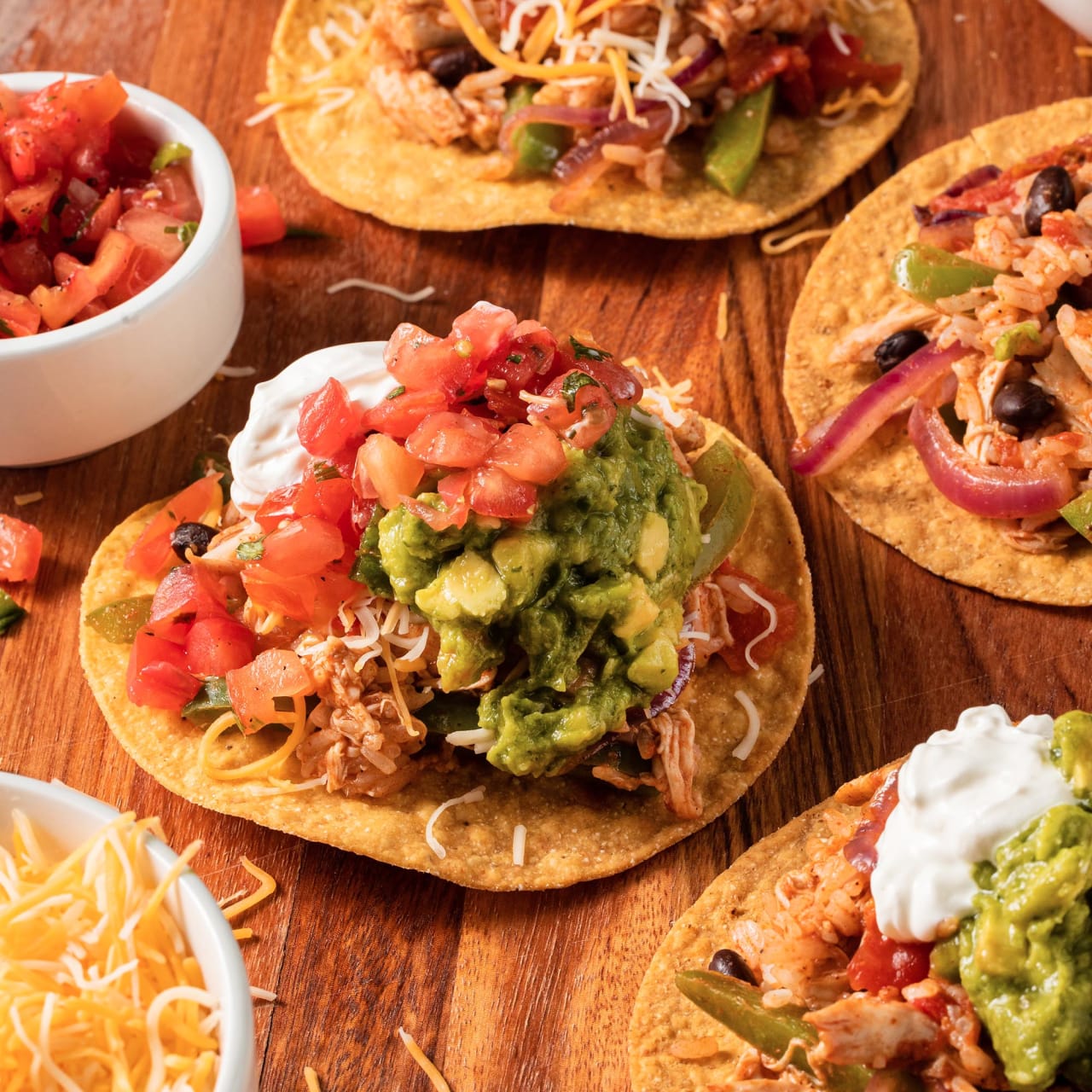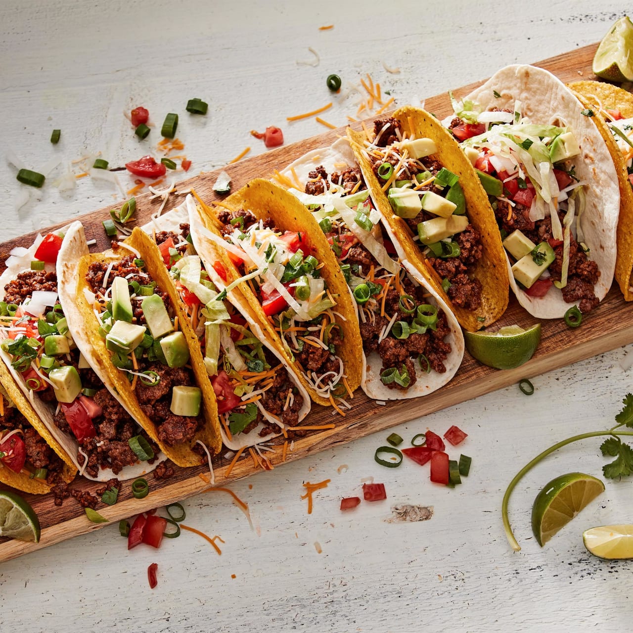 tacos with flour tortillas and mango salsa on cutting board