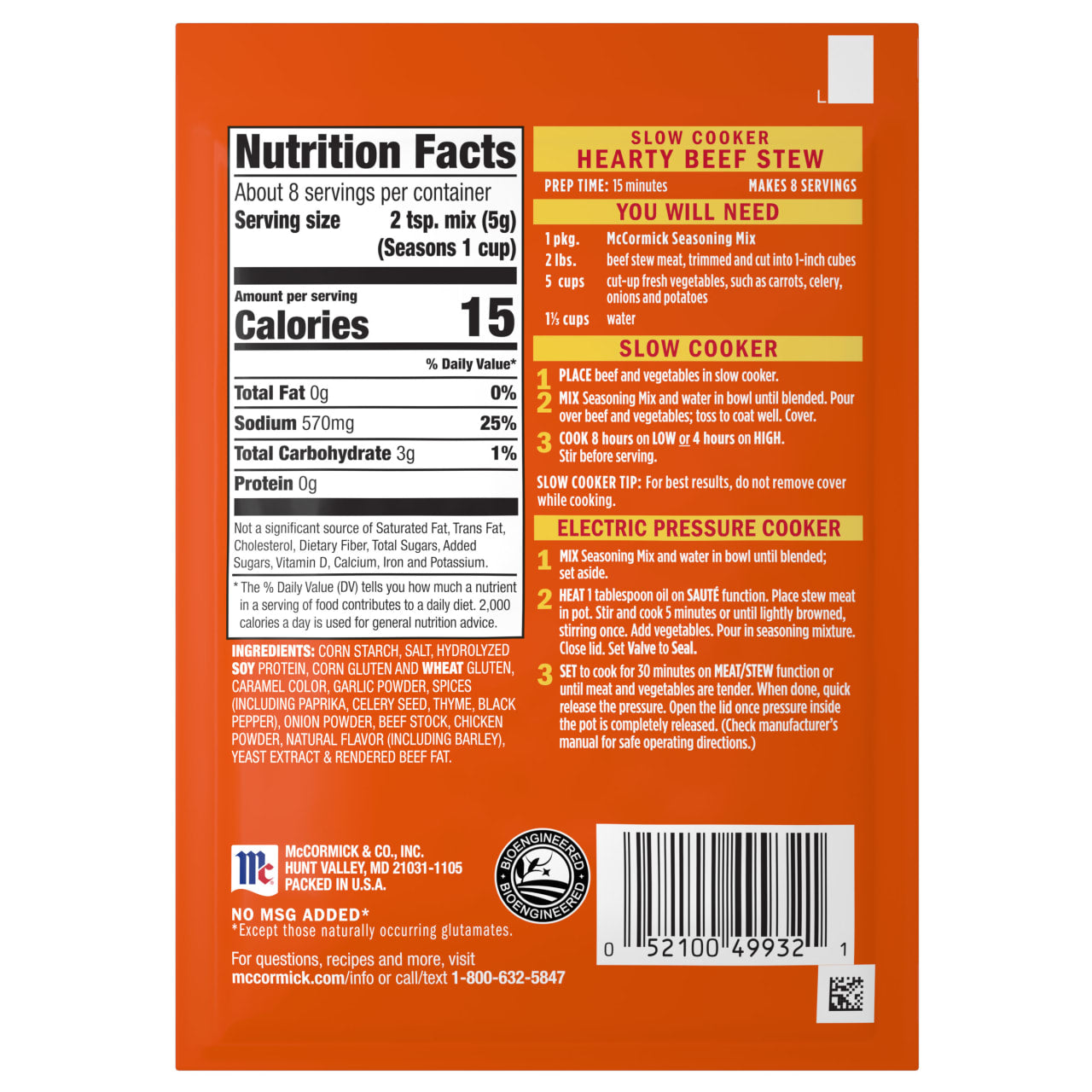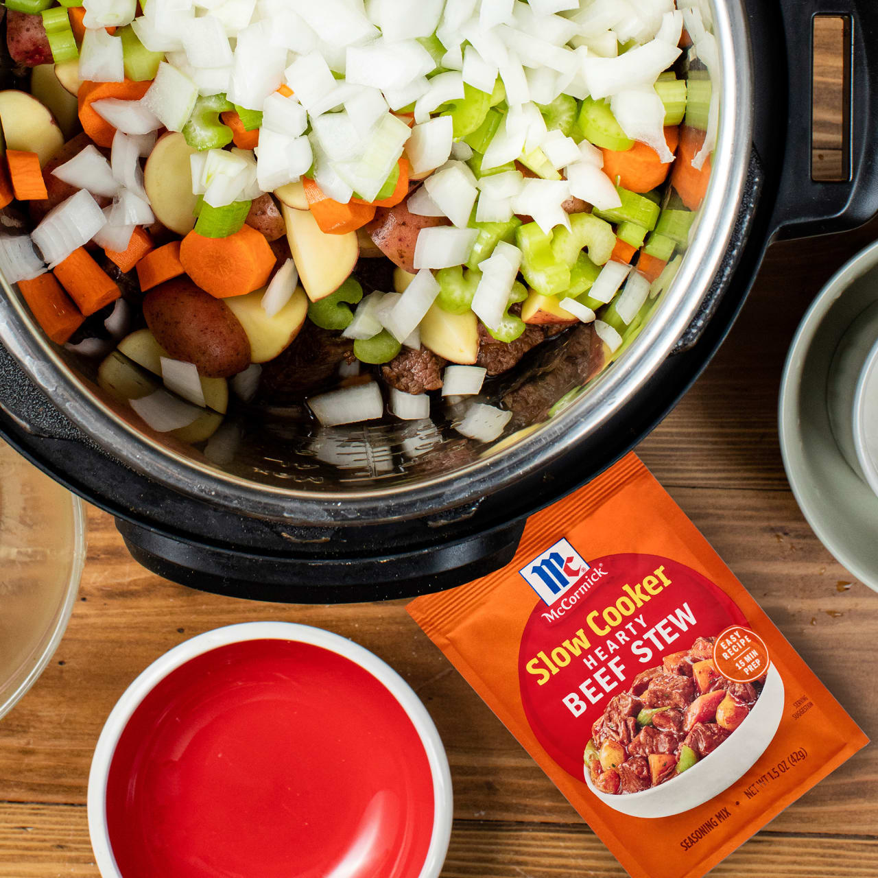 To Prepare McCormick Slow Cooker Hearty Beef Stew Seasoning Mix in a Slow Cooker: Place 2 lb. beef stew meat, trimmed and cut into 1-inch cubes, and 5 cups cut-up fresh vegetables, such as carrots, celery, onions, and potatoes, in slow cooker. Mix Seasoning Mix and 1 1/3 cups water in bowl until blended. Pour over beef and vegetables; toss to coat well. Cover. Cook 8 hours on LOW or 4 hours on HIGH. Stir before serving. SLOW COOKER TIP: For best results, do not remove cover while cooking._x000D_To Prepare McCormick Slow Cooker Hearty Beef Stew Seasoning Mix in an Electric Pressure Cooker: Mix Seasoning Mix and 1 1/3 cups water in bowl until blended; set aside. Heat 1 tbsp. oil on SAUTÉ function. Place 2 lb. beef stew meat, trimmed and cut into 1-inch cubes, in pot. Stir and cook 5 minutes or until lightly browned, stirring once. Add 5 cups cut-up fresh vegetables, such as carrots, celery, onions, and potatoes. Pour in seasoning mixture. Close lid. Set VALVE to SEAL. Set to cook for 30 minutes on MEAT/STEW function or until meat and vegetables are tender. When done, quick-release the pressure before opening. Open the lid once pressure inside the pot is completely released. (Check manufacturer’s manual for safe operating directions.) Makes 8 servings.