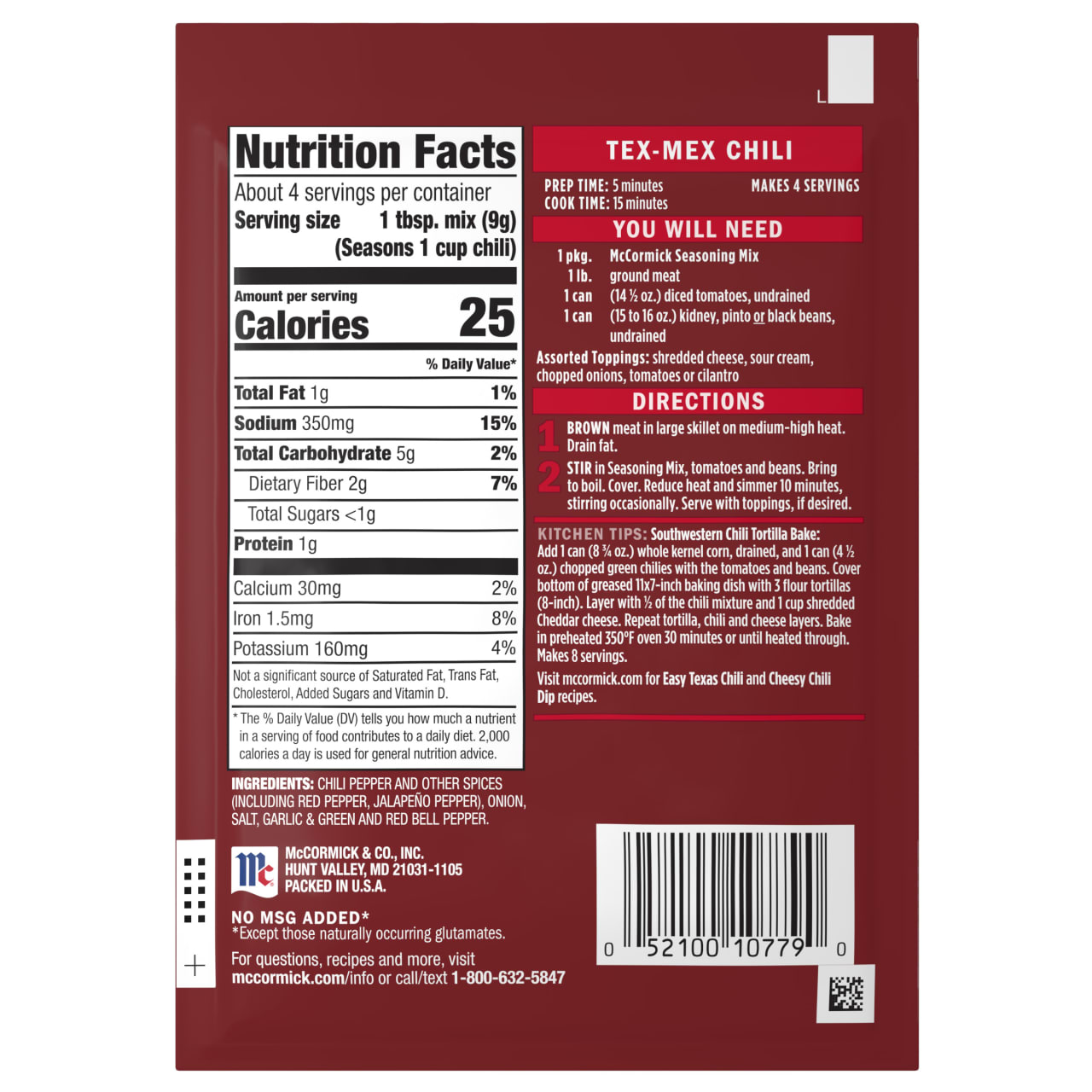A bold blend of McCormick spices, Tex-Mex Chili Seasoning Mix makes family-favorite chili every single time. Our signature mix is crafted with chili pepper, jalapeño pepper, onion, garlic and bell peppers, and contains no added MSG or artificial flavors.